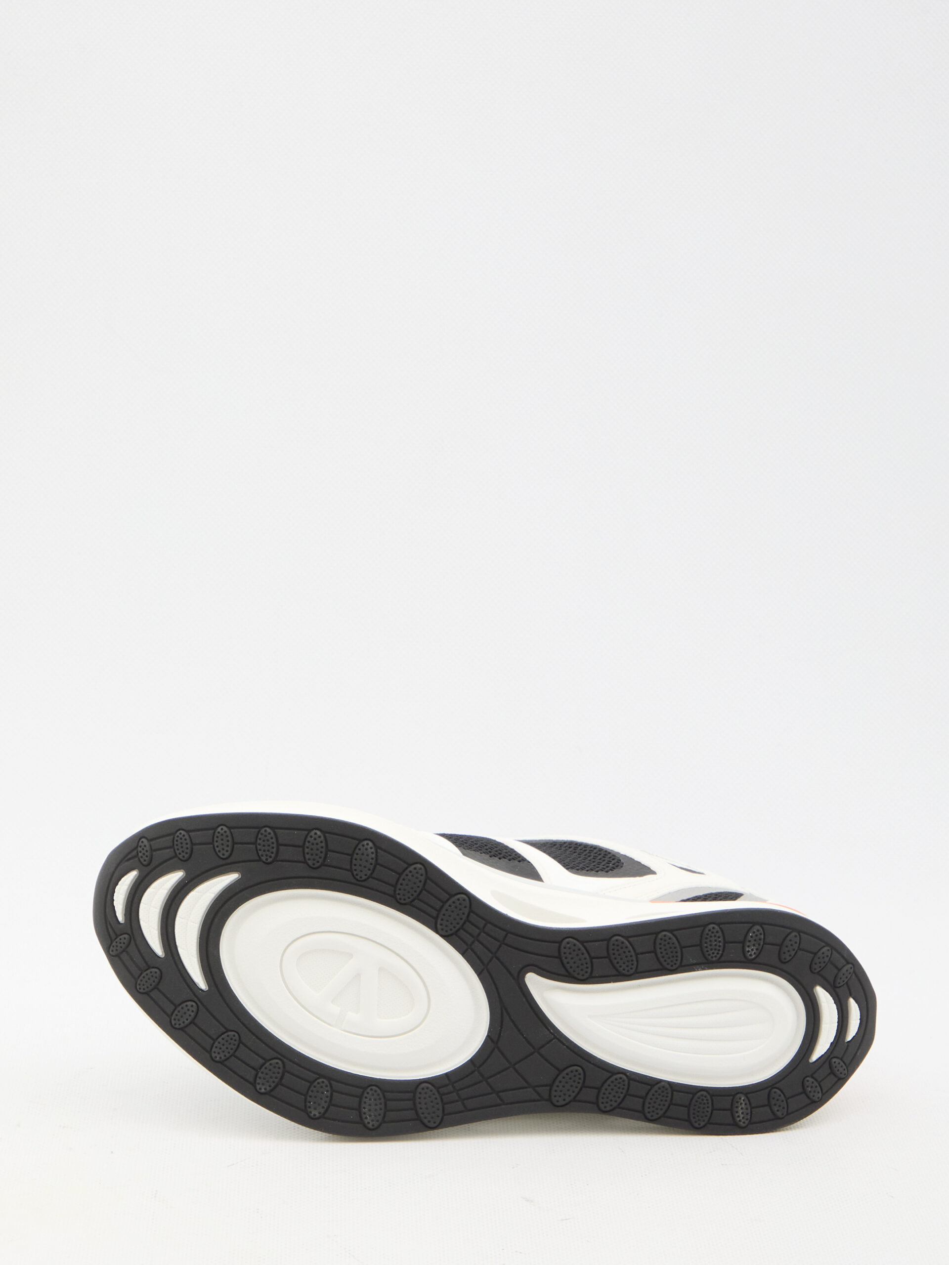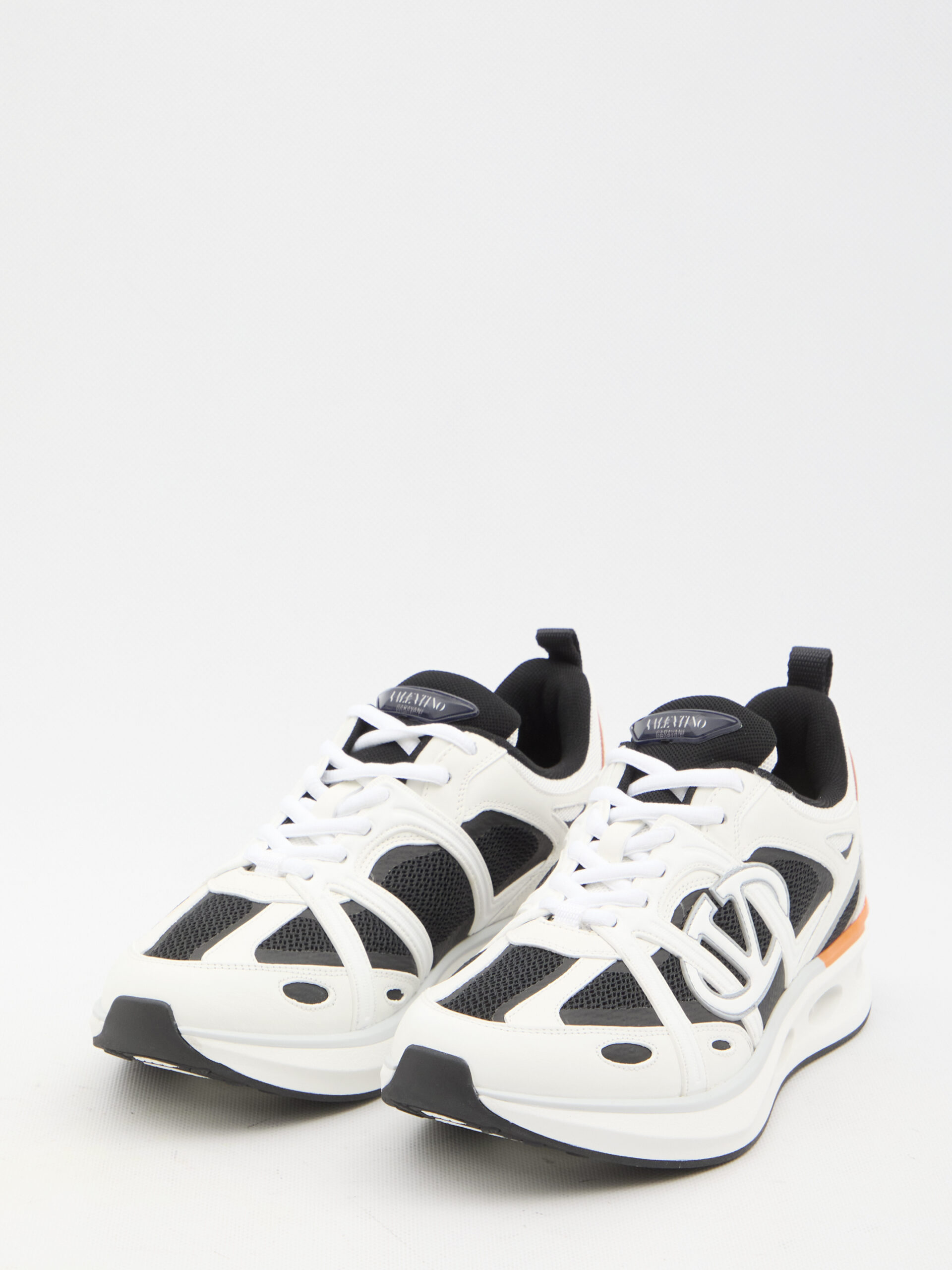 Valentino Garavani Low Top VLogo Easyjog sneakers in white, black and orange calfskin and fabric with side VLogo Signature detail. They feature lace-up closure, reflective Valentino Garavani logo on tongue, reinforced heel and fabric rear loop tab and ultralight rubber sole. Dust bag included. Additional laces included. Any leather imperfections are not to be considered manufacturing defects, but a peculiarity of the material.