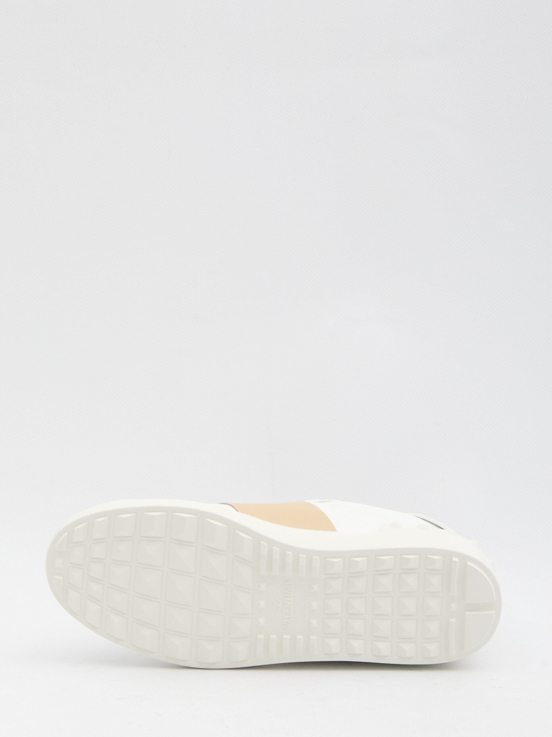 White calfskin sneakers with a Sahara beige insert. They feature a round toe, lace-up closure, a Valentino Garavani logo tag on the tongue, and a rubber Rockstud sole. Dustbag and extra laces included. Any imperfections in the leather should not be considered manufacturing defects but rather a characteristic of the material.