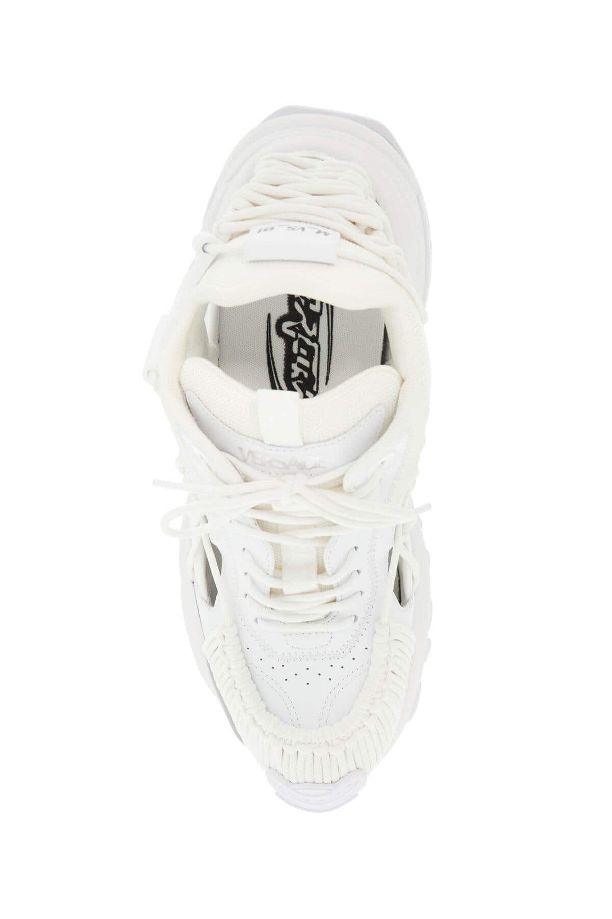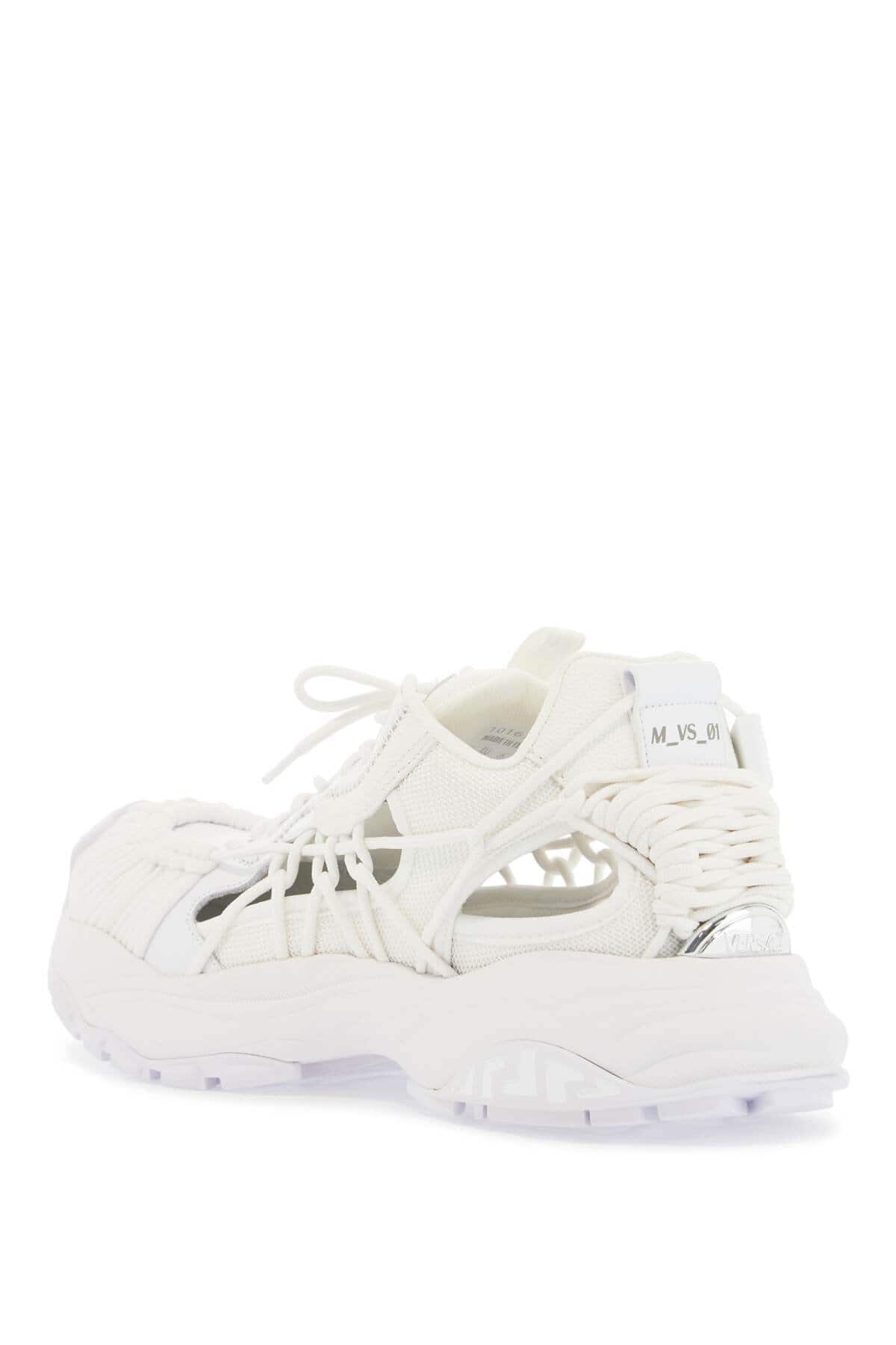 The Mercury M_VS_01 sneakers by Versace are characterized by a futuristic design, with an upper made of leather and fabric topped with a hand-knotted cord weave. They feature a tongue with silver logo lettering and a ribbon pull tab, a removable insole, the code M_VS_01 on the heel, and a rubber sole with a Greca pattern.