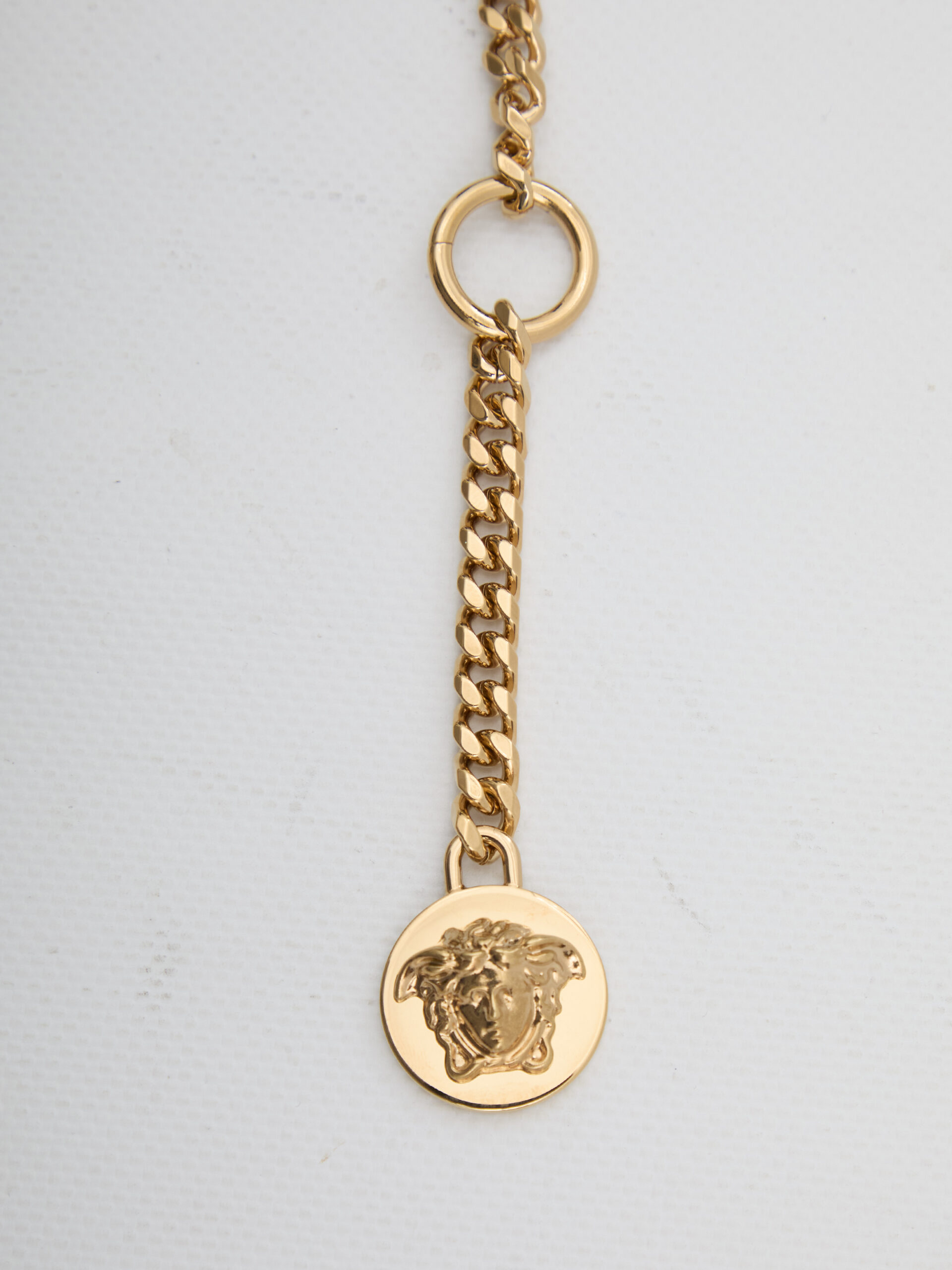 Adjustable Versace gold-tone metal chain belt with Medusa, featuring a hook closure.