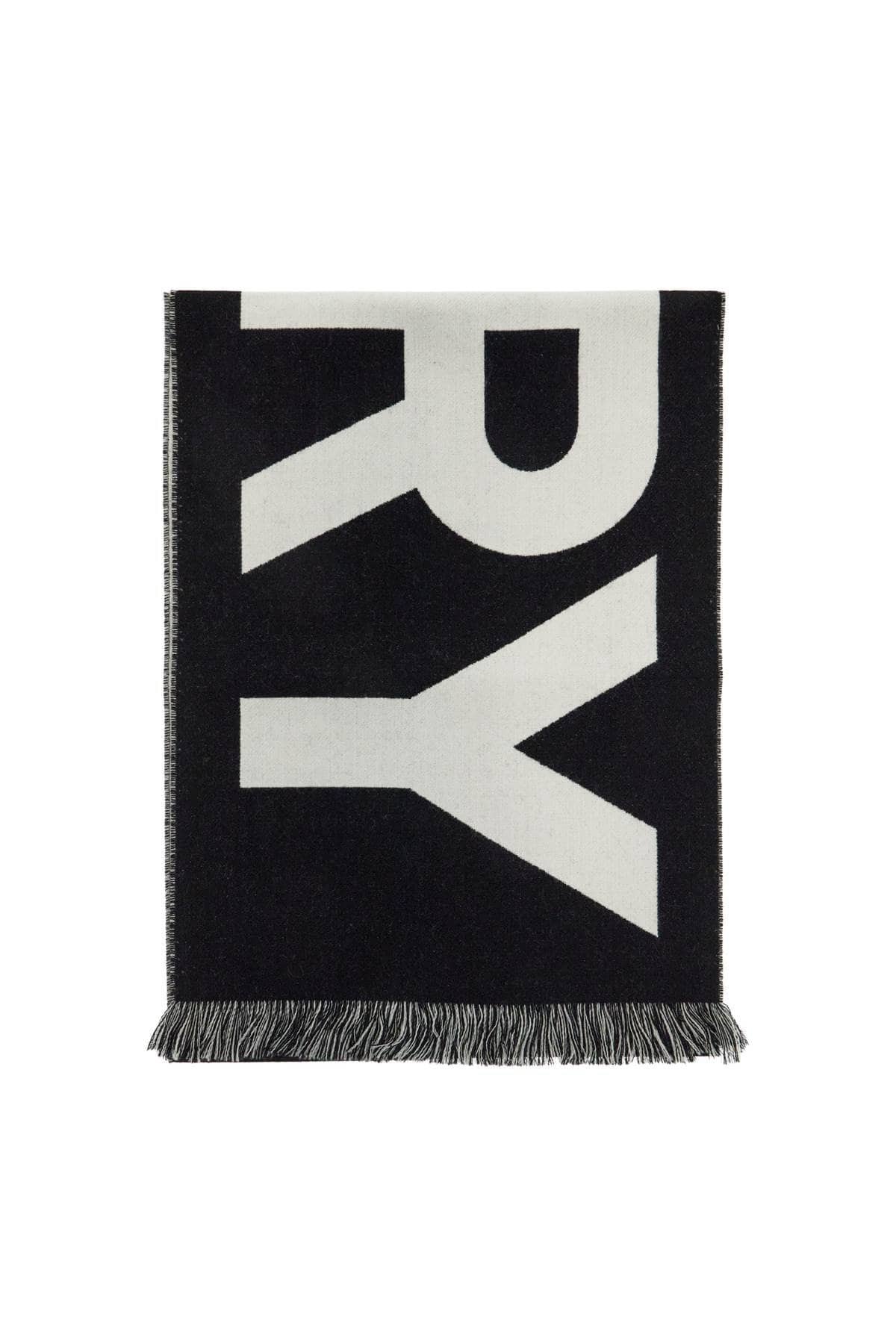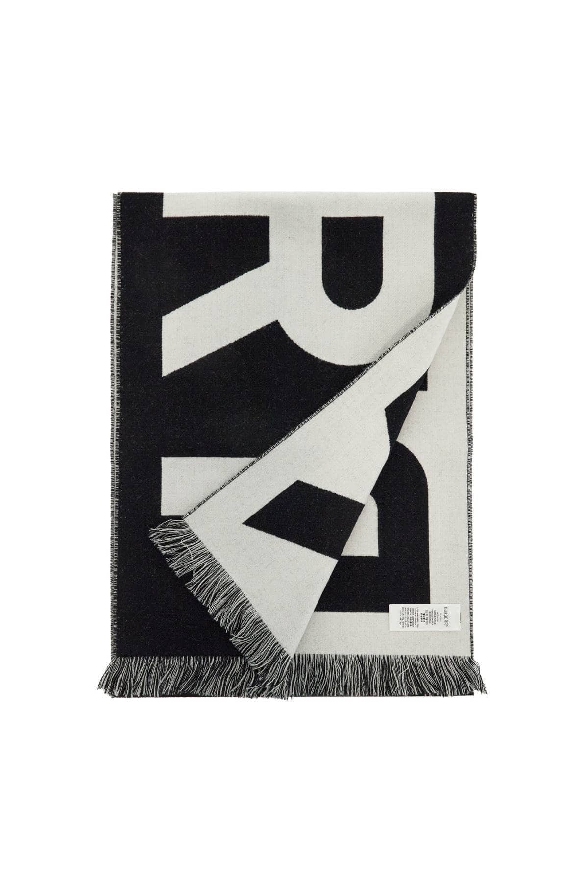 Burberry wool scarf with contrasting lettering logo motif all over. Fringed ends.