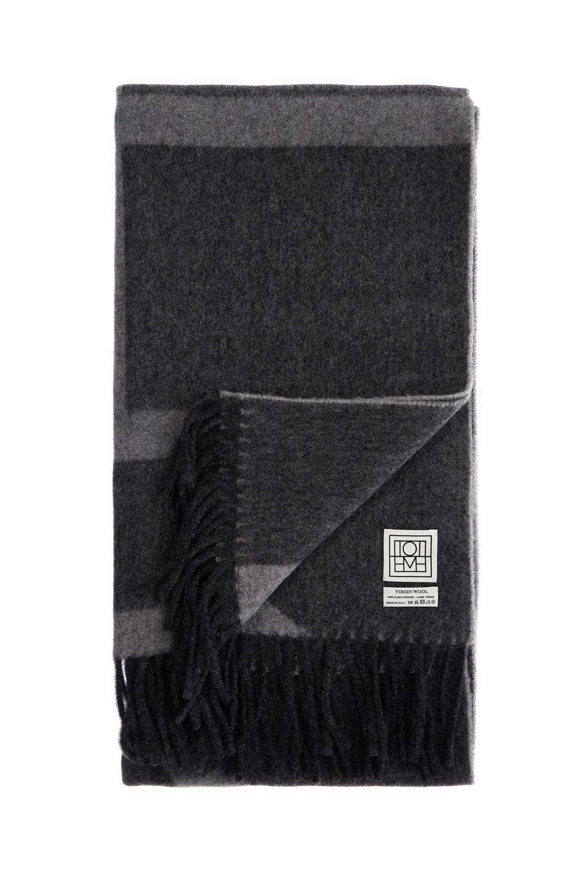 The TOTEME jacquard scarf in RWS virgin wool offers timeless elegance. Made in Italy with a gray monogram pattern and fringes, it combines sustainable luxury and versatility for every outfit.