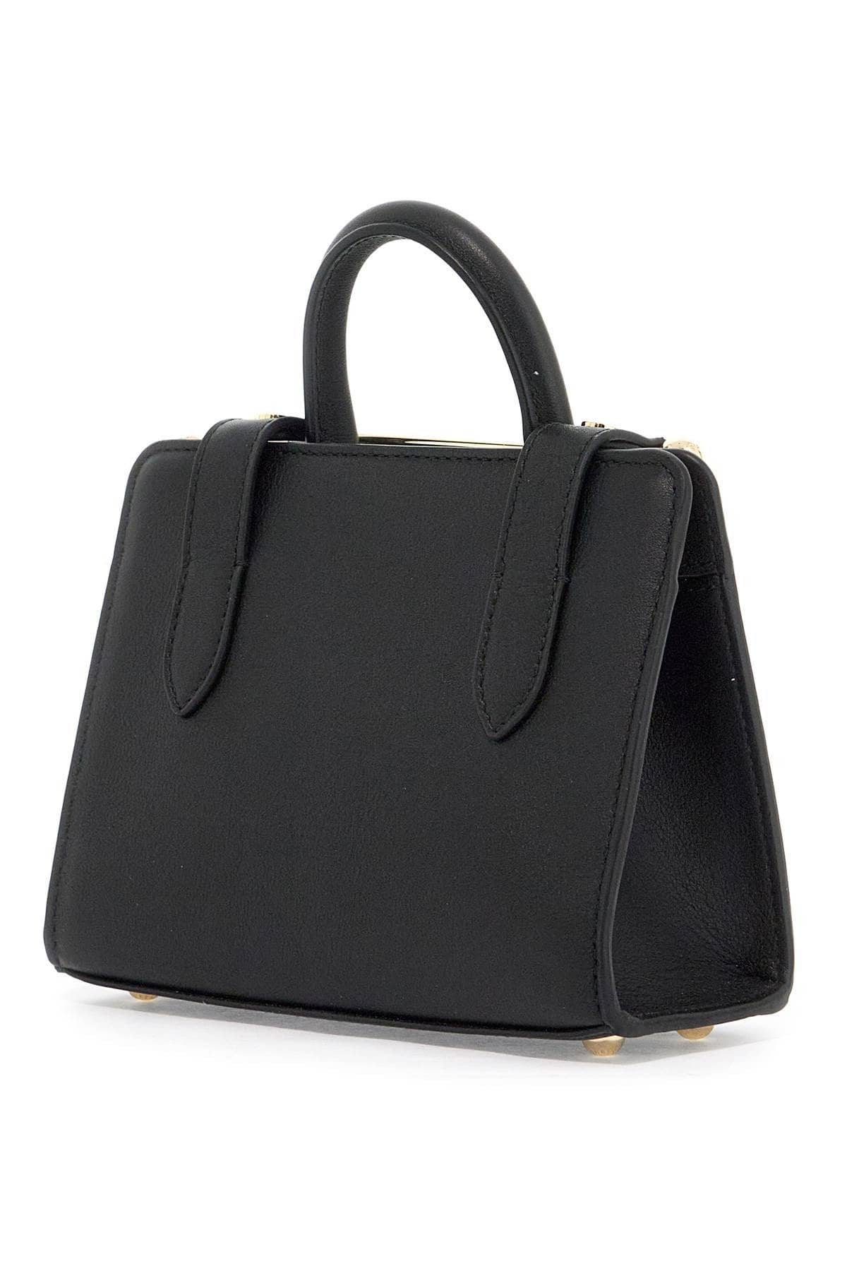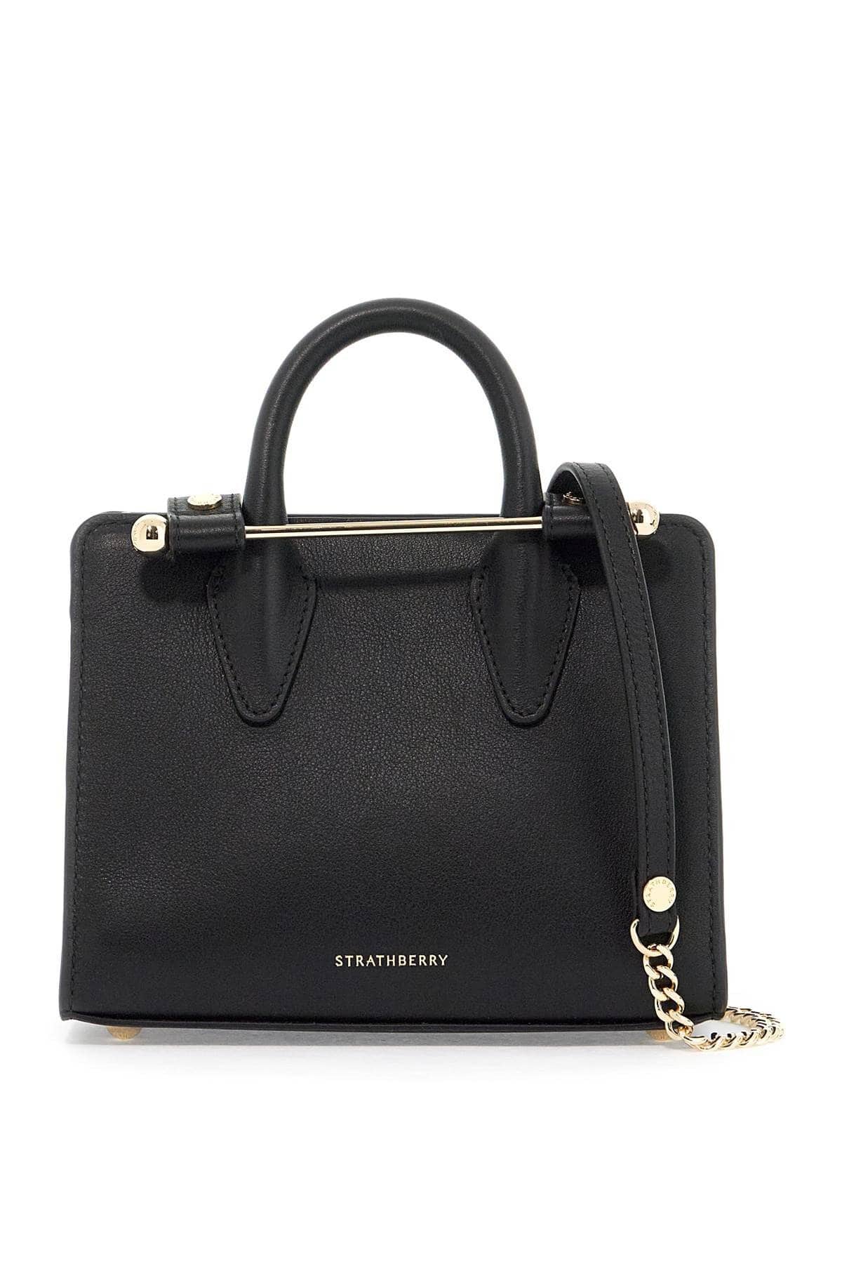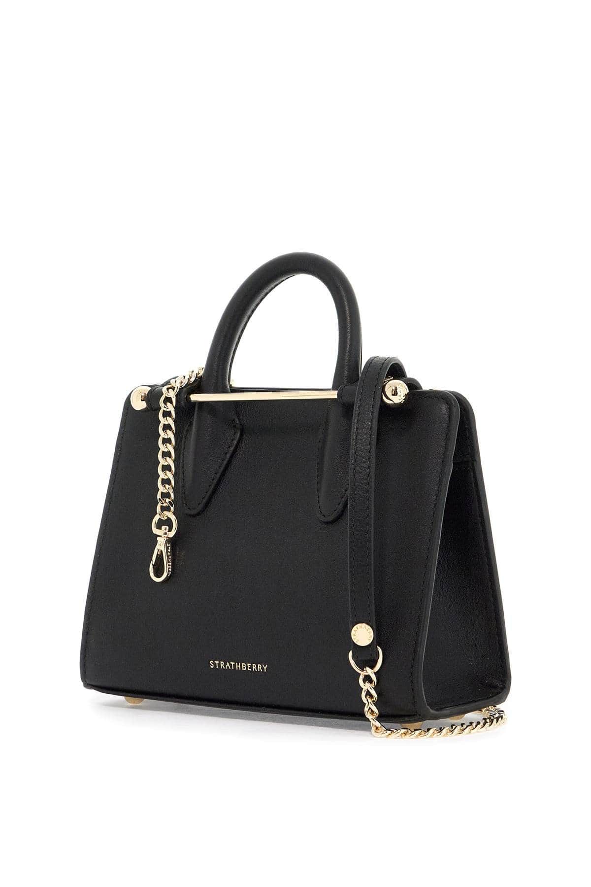 Nano Tote bag by Strathberry in smooth leather, featuring the iconic metal bar which closes the bag stopping the single top handle. Gold-tone lettering logo print on front, magnetic closure, gusseted sides, suedette lining and one inner open flat pocket. Equipped qith detachable chain strap with leather insert. Gold-finished metalware and protective studs.