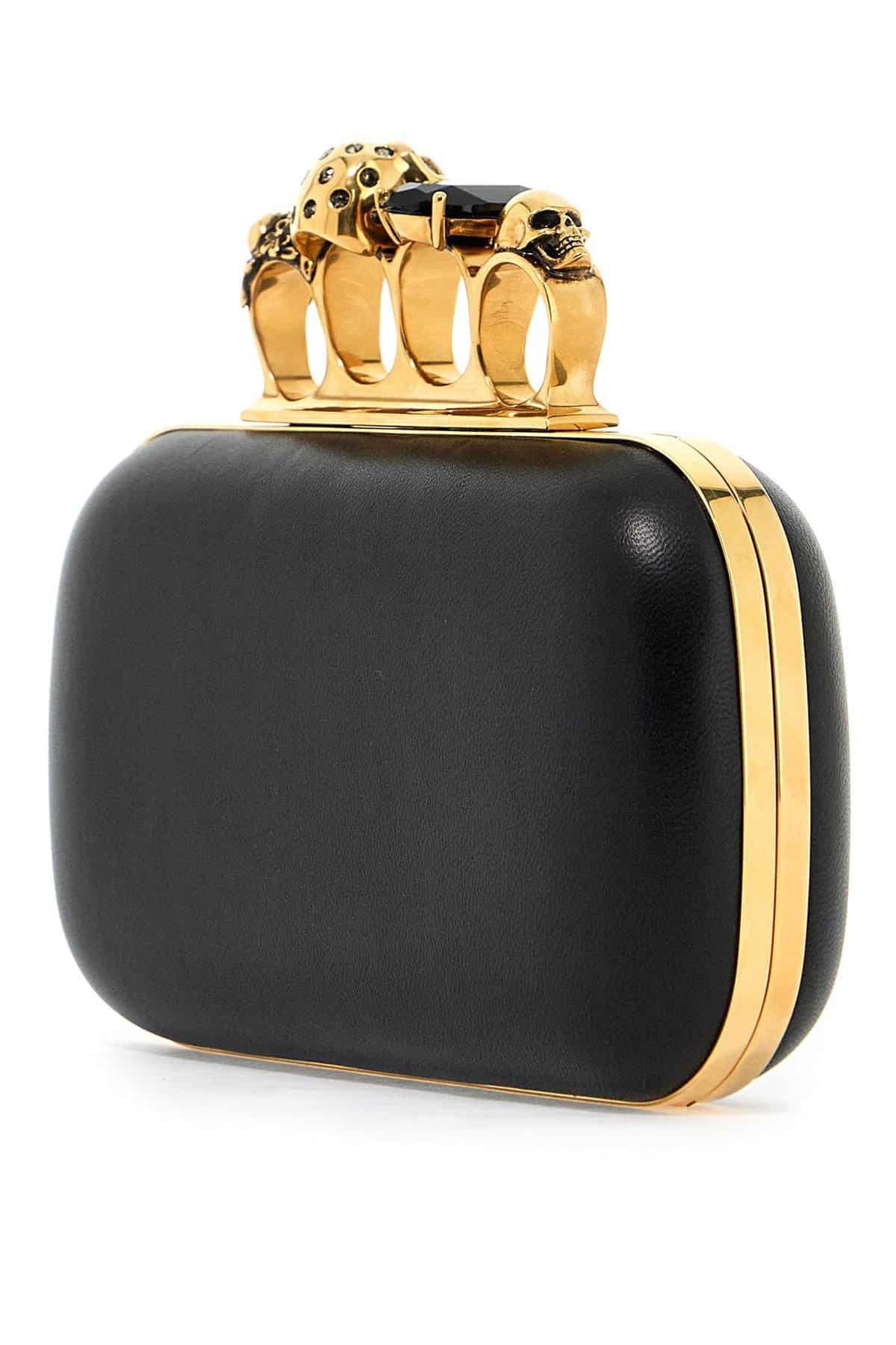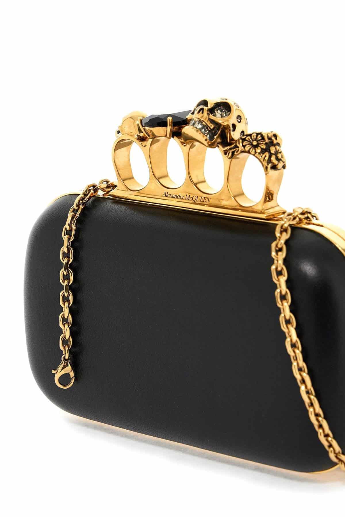 The Alexander McQueen clutch is made of soft leather and embellished with a Knuckle handle in antique gold finish, featuring rings with Skulls and crystals. It has a snap closure, suede interior, and an additional chain strap for a shoulder look.