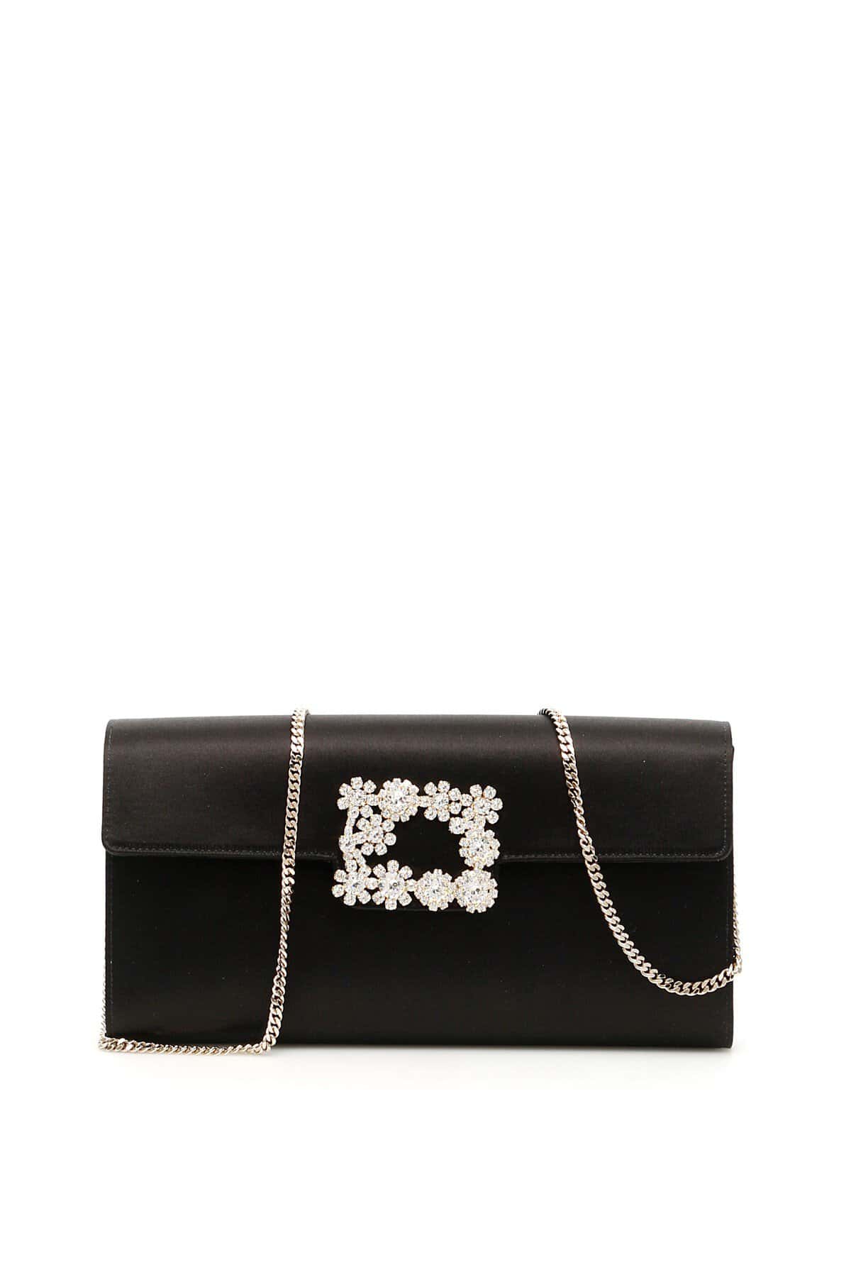 Roger Vivier satin clutch with sliding chain strap and magnetic button on the flap. Crystal-embellished flower buckle, satin lining, two inside compartments, inside pocket. Gold-tone metal hardware.