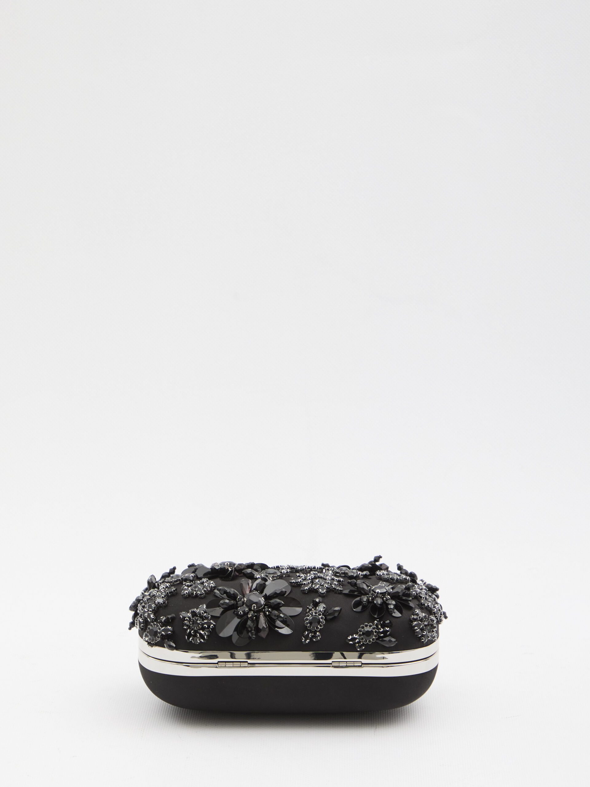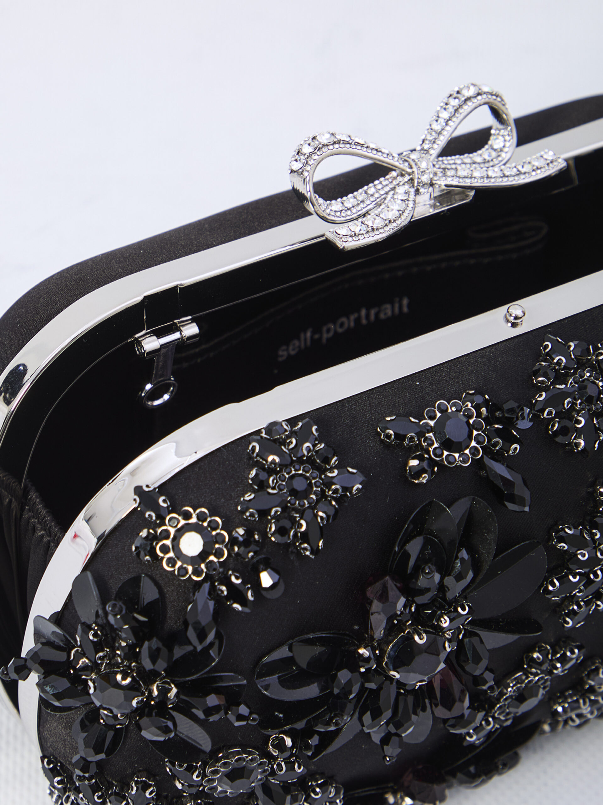 Black satin clutch embellished with floral crystals. Features a removable chain shoulder strap, silver crystal bow detail, clasp closure, and a main compartment with a flat pocket. Dust bag included.