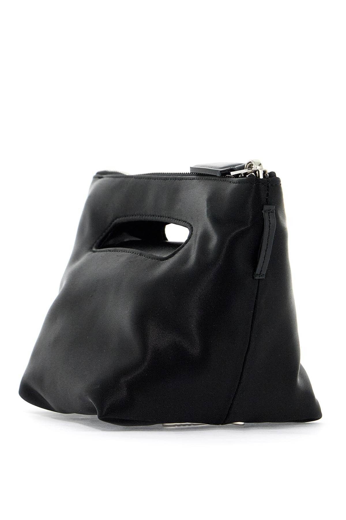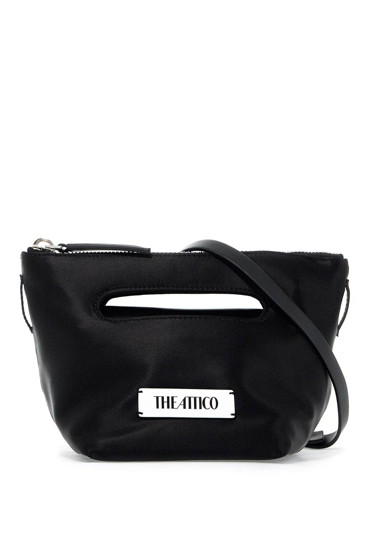 The Attico’s Clutch Via dei Giardini 15 is a geometrically designed luxury satin clutch with a rubber logo patch on the front. It features a zip closure and magnetic leather flap, as well as an additional leather shoulder strap. The metal accessories have a silver finish.