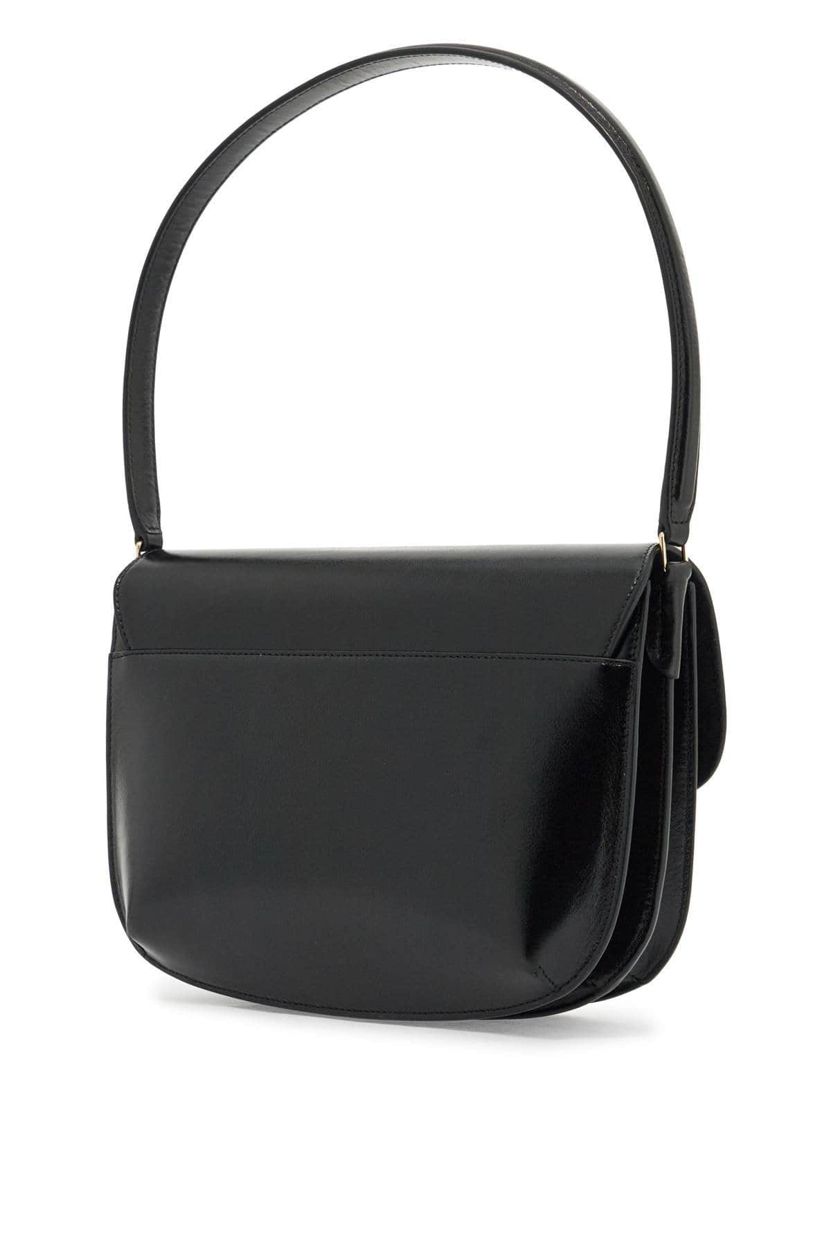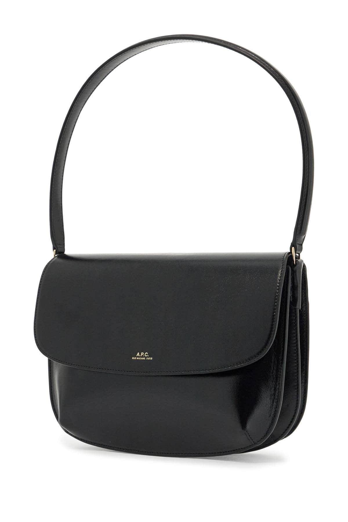 The Sarah shoulder bag by A.P.C. is made of naplak leather with a small gold lettering logo on the flap. It features a magnetic closure and a fabric interior divided into two gusseted compartments, one of which has an open pocket.