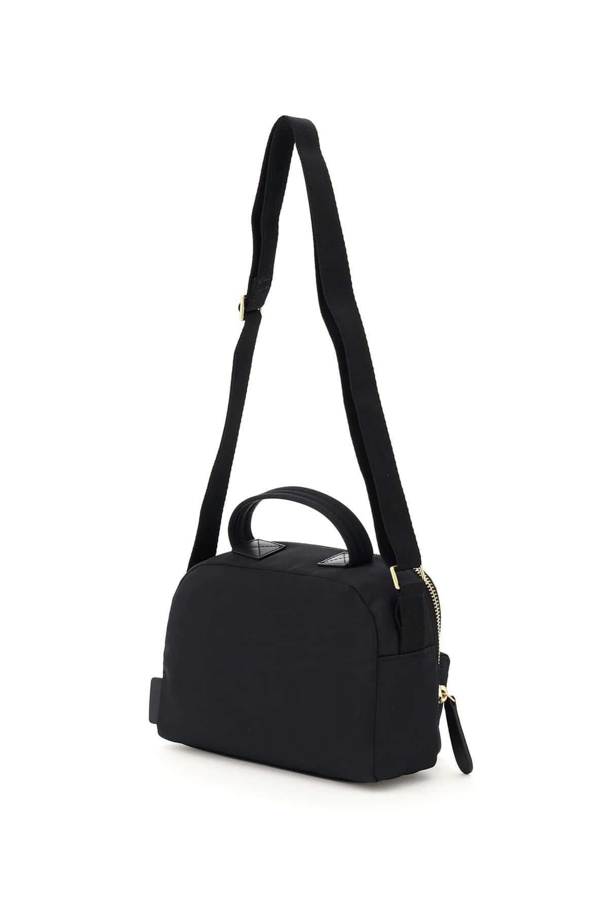Anya Hindmarch camera bag in Econyl regenerated nylon fabric with single handle, adjustable shoulder strap and the iconic Eyes leather patch applied on front. Zip closure, front zip compartment, side label with gold-tone logo print. Interior lined in nylon with an open pocket and three credit card pockets. Gold-tone metalware.