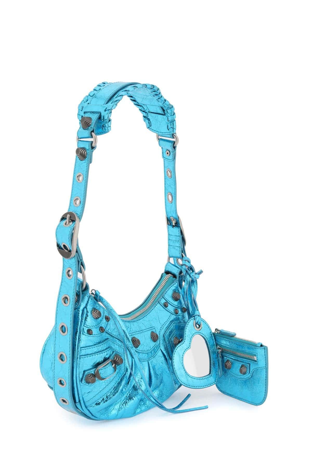 Le Cagole XS bag by Balenciaga crafted in metallized Arena leather, enriched with metal studs, removable flat pouch with two zippered pockets and removable heart-shaped mirror. Carriable on the shoulder or crossbody with the adjustable shoulder strap/handle with shoulder pad characterized by the leather embroidered edges. Zip closure, cotton canvas lining, antique silver-finished metalware.
