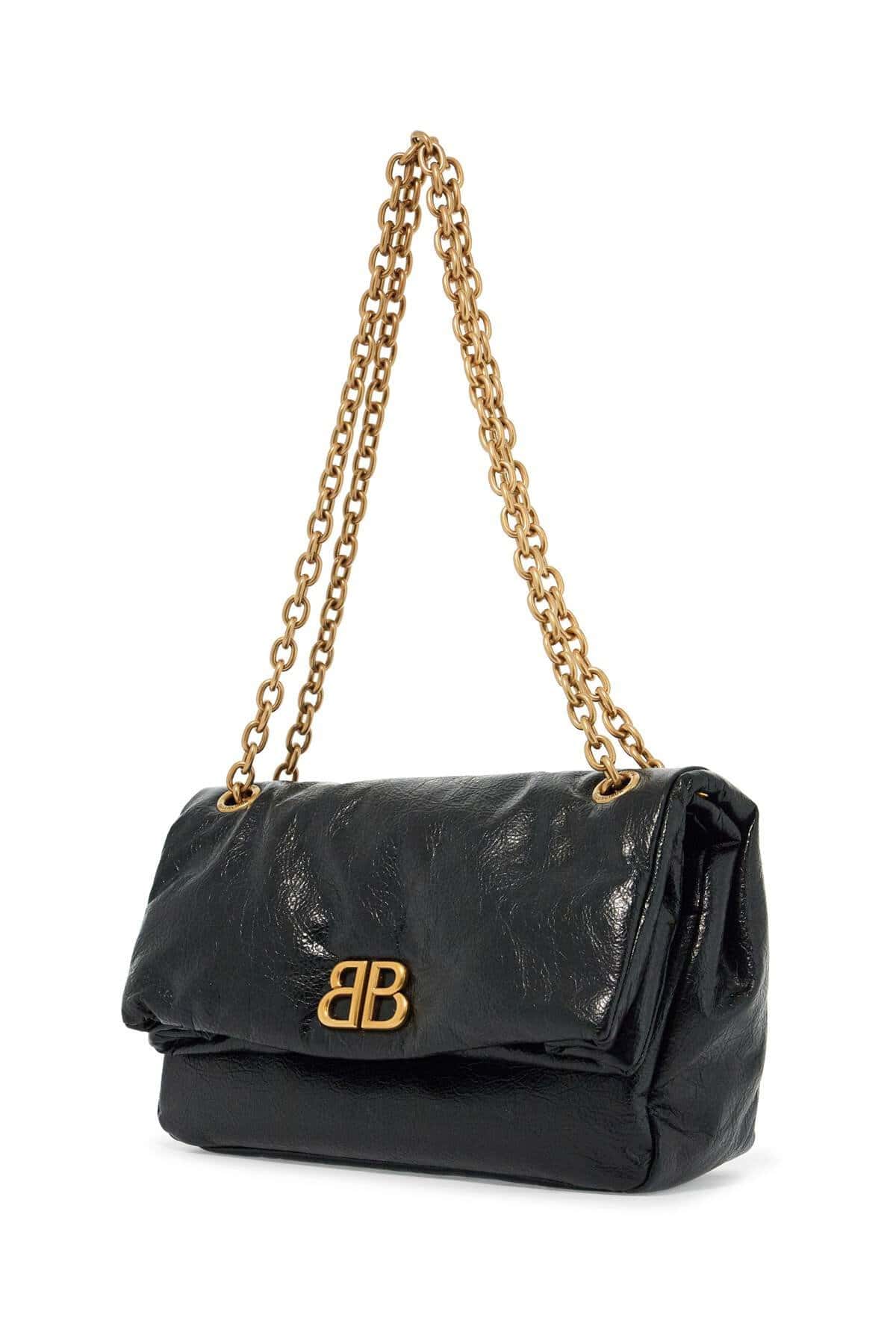 The Balenciaga Monaco shoulder bag is made of padded Arena leather with gold metal BB appliqus on the flap. It features a magnetic closure, fabric interior with an open pocket, an additional pocket under the flap, and side buttons for extra space. The double sliding chain handle allows for a crossbody look as well.