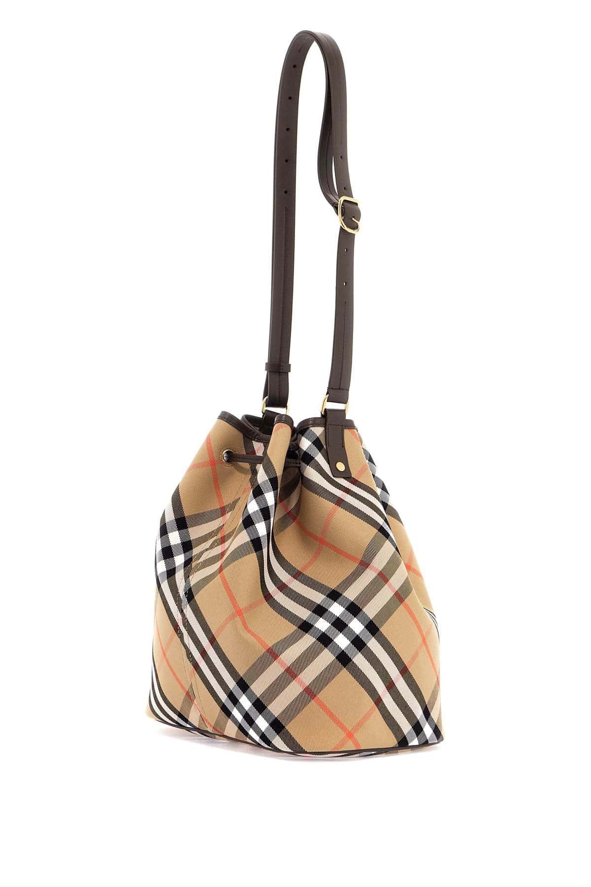 This bucket bag is made of cotton with a Burberry Check pattern woven into it and smooth leather finishes. It has a slightly structured design with a drawstring closure, complete with a shield-shaped stopper, an unlined interior, and an adjustable shoulder strap. Finished with hand-painted edges and shiny gold metal elements.