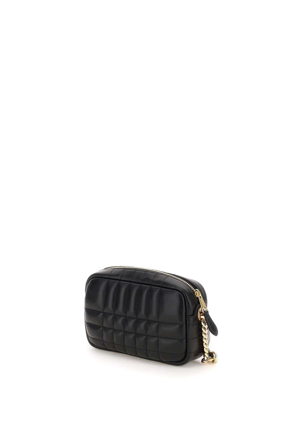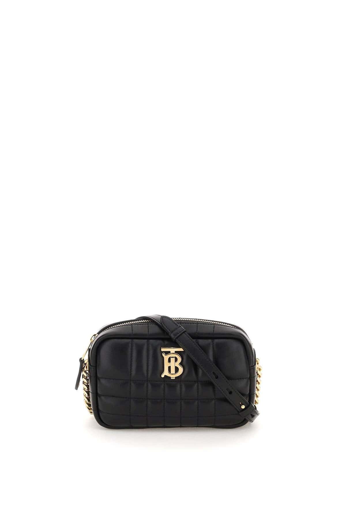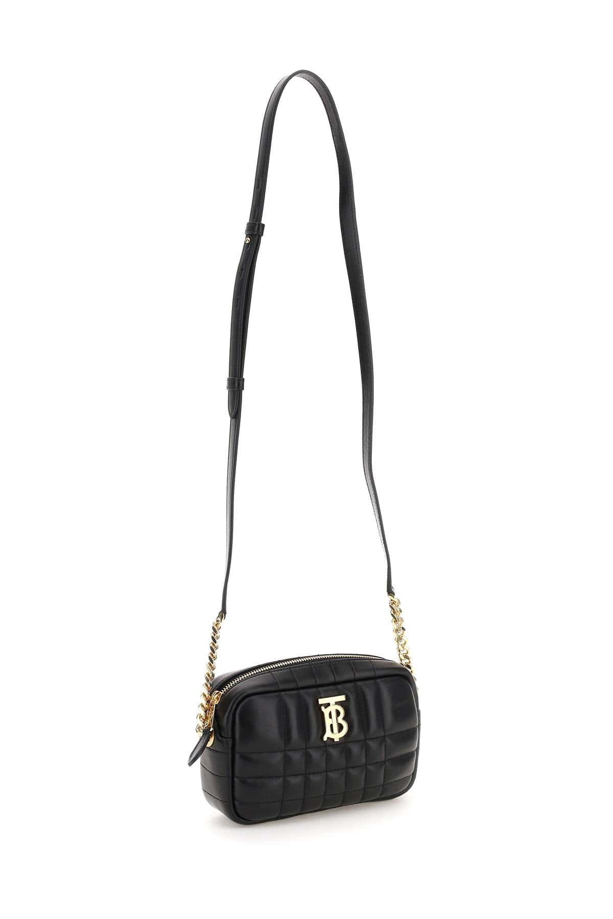 Lola camera bag by Burberry in soft quilted leather with metal TB monogram on front. Zippered closure, fabric interior with one leather open pocket, adjustable leather shoulder strap with chain insets and gold-finished metalware.