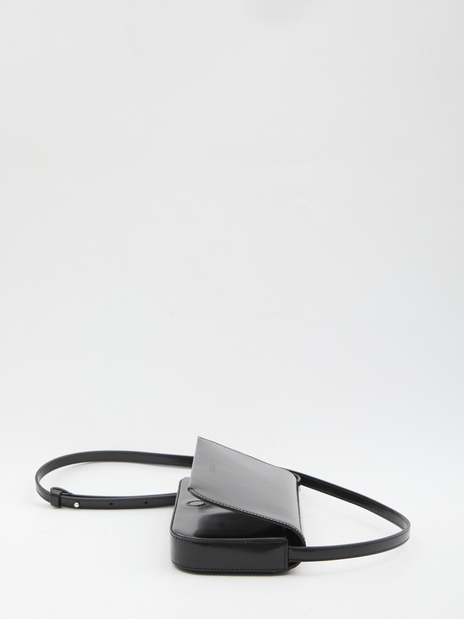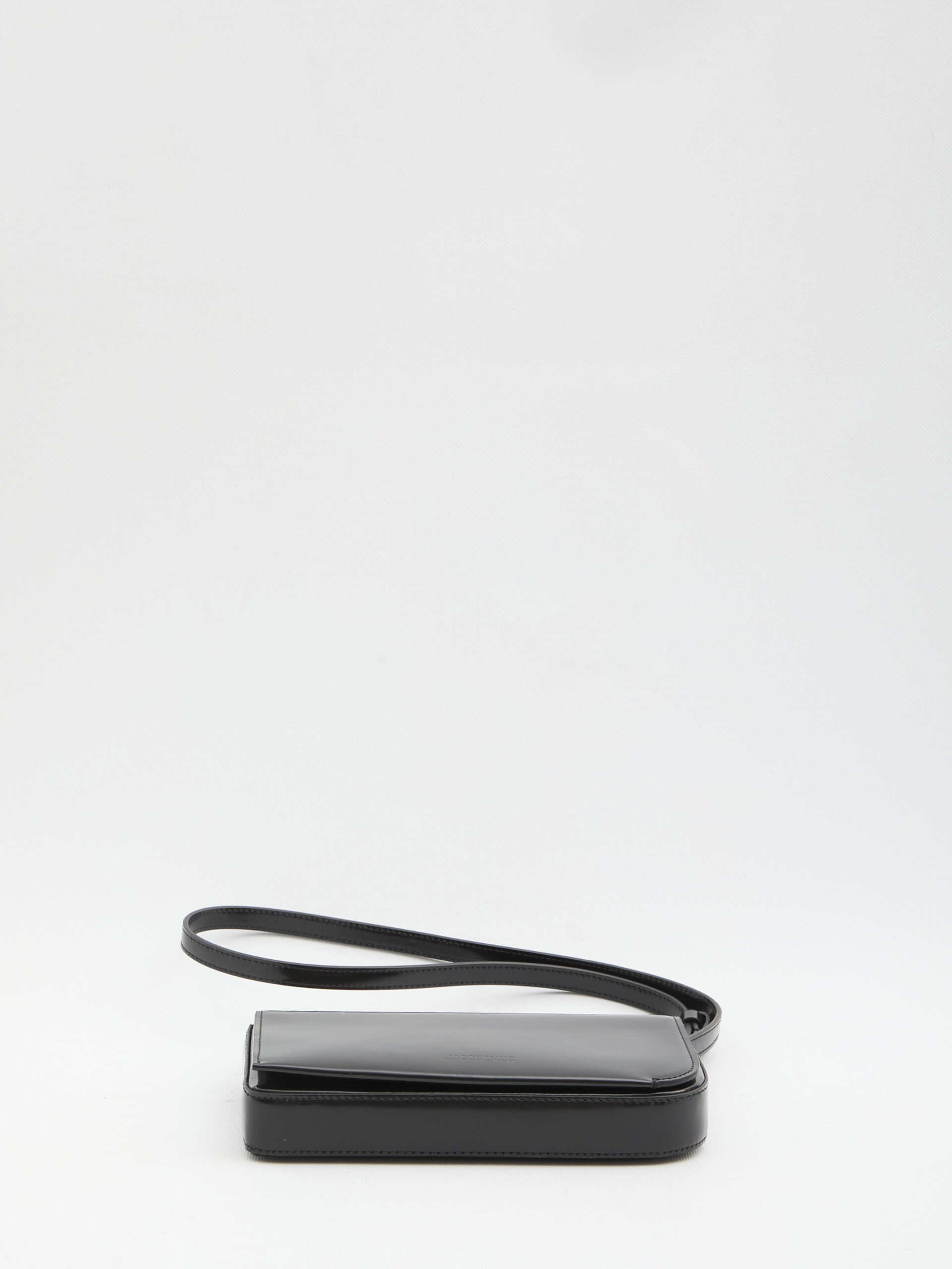 Crossbody bag in glossy black calfskin. It features an asymmetrical shape with curved and squared edges, an adjustable strap, an embossed Jacquemus signature on the front, an applied back pocket, a magnetic flap closure, one main compartment, one internal credit card pocket, and cotton lining. Dustbag included. Any natural imperfections in the leather are not manufacturing defects but a characteristic of the material.