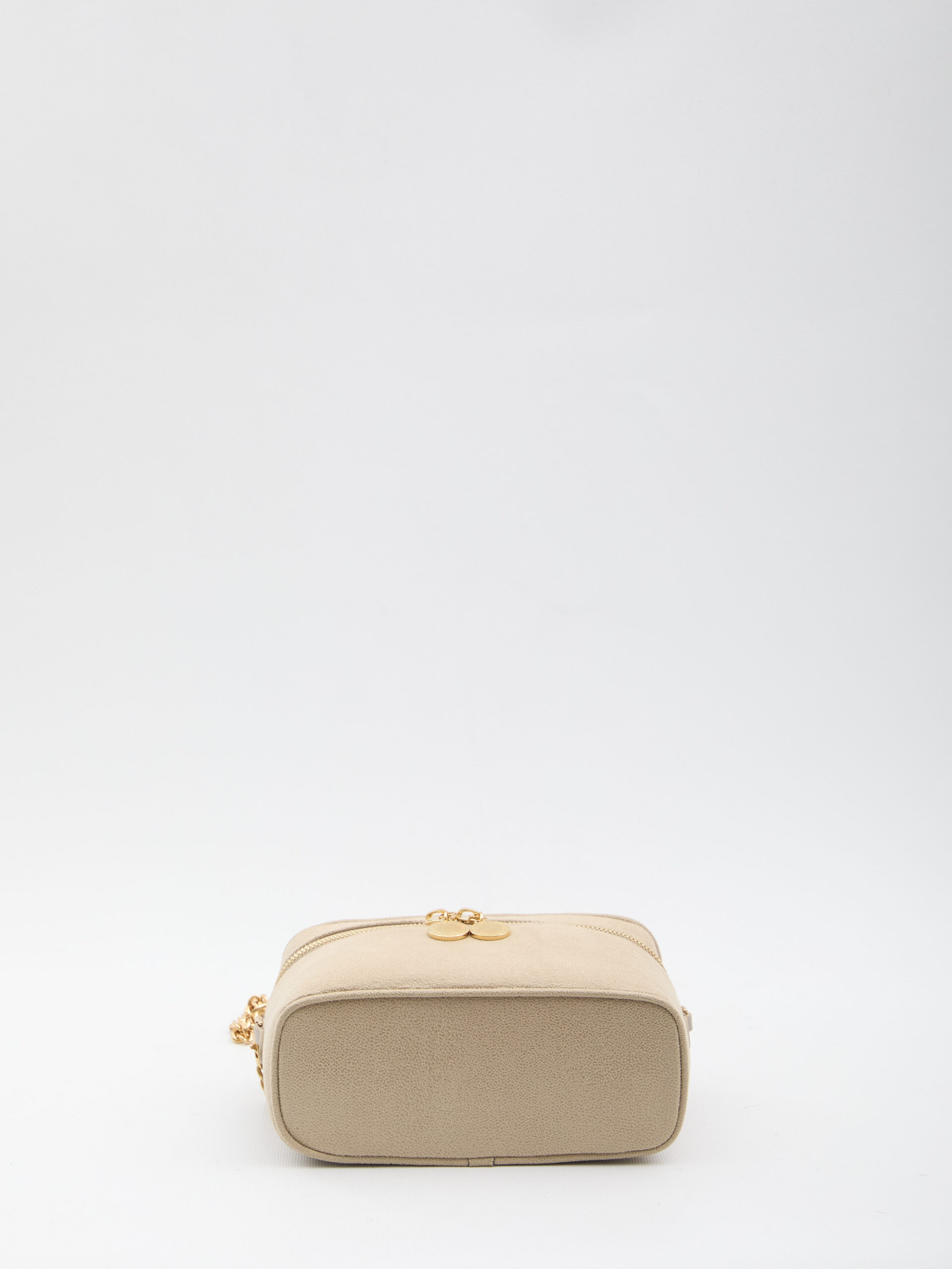 Shaggy Deer cream suede fabric bag. Features a fixed top handle wrapped in organic cotton laces with a metal detail, a removable chain shoulder strap with a faux leather insert, double-zip closure, one main compartment with a flat pocket. Faux leather lining. Dustbag included.