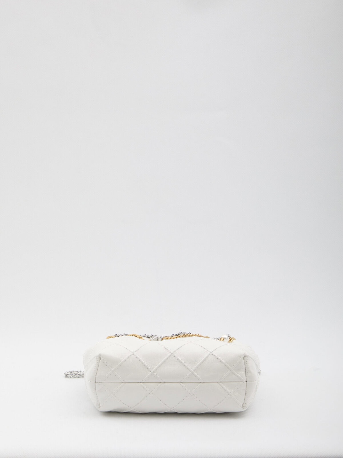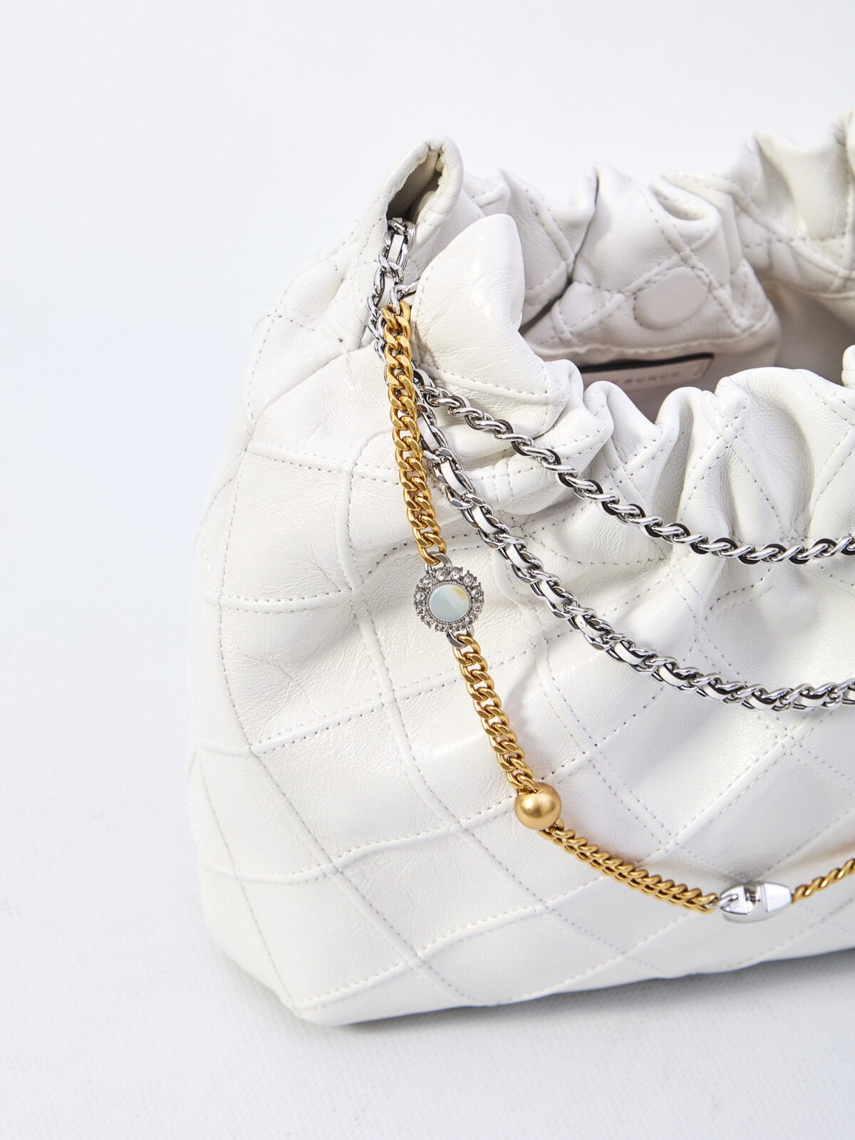 White quilted nappa leather bag. It features a chain shoulder strap, applied charms on the front, drawstring and magnetic button closure, one main compartment, and fabric lining. Dustbag included. Any imperfections in the leather are not considered manufacturing defects, but a characteristic of the material.