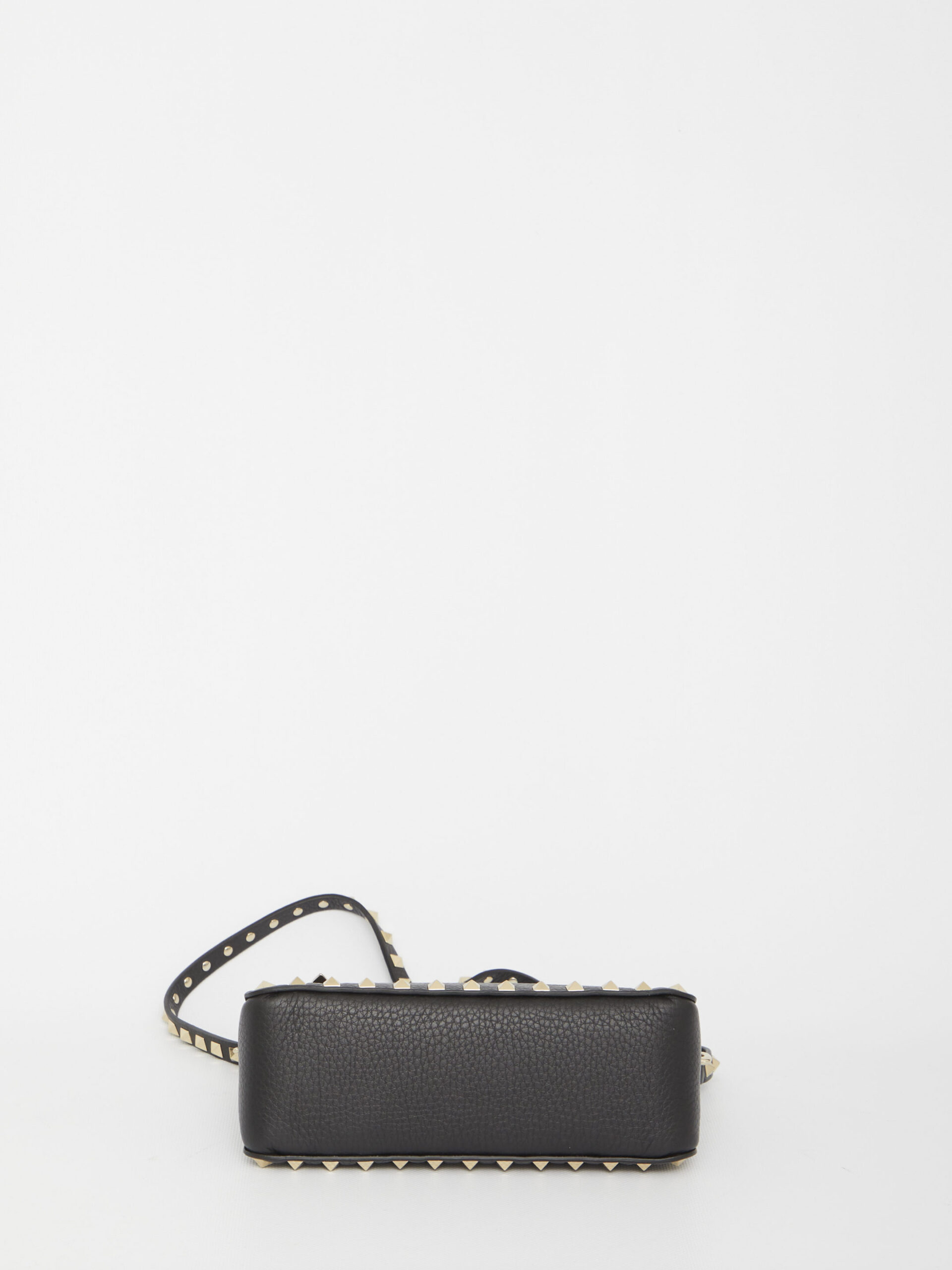 Valentino Garavani Rockstud small crossbody bag in black grained calfskin with platinum-finish studs. It features fixed top handle, adjustable and detachable shoulder strap, double closure with zip and hook, one main interior compartment and one interior card slot. Dust bag included. Any leather imperfections are not to be considered manufacturing defects, but a peculiarity of the material.