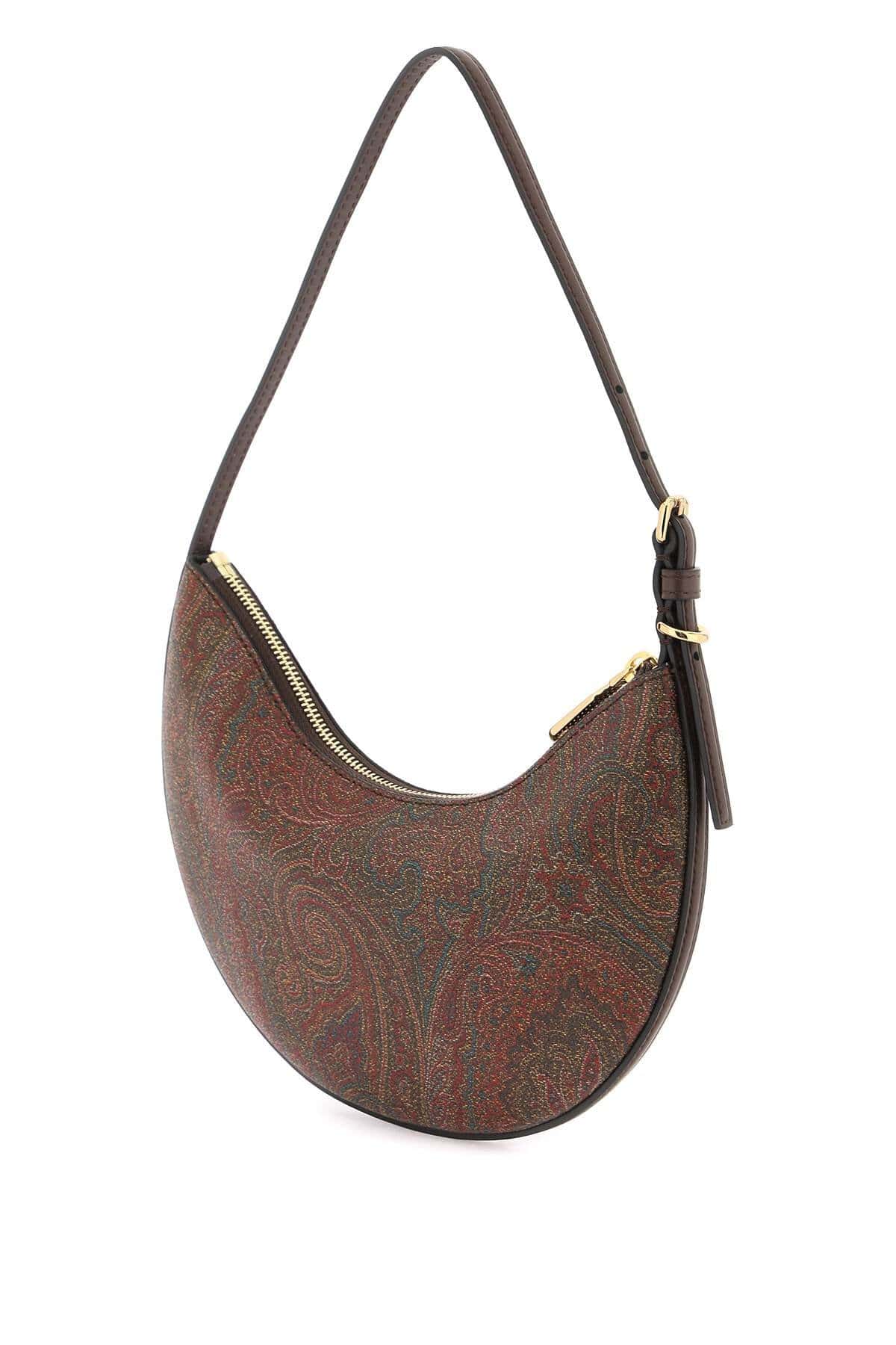 Small Essential ETRO hobo bag crafted in the distinctive coated canvas featuring jacquard Paisley pattern and finished with leather details. Zip closure, suede-microfiber lining, top adjustable handle. Gold-finished metalware.