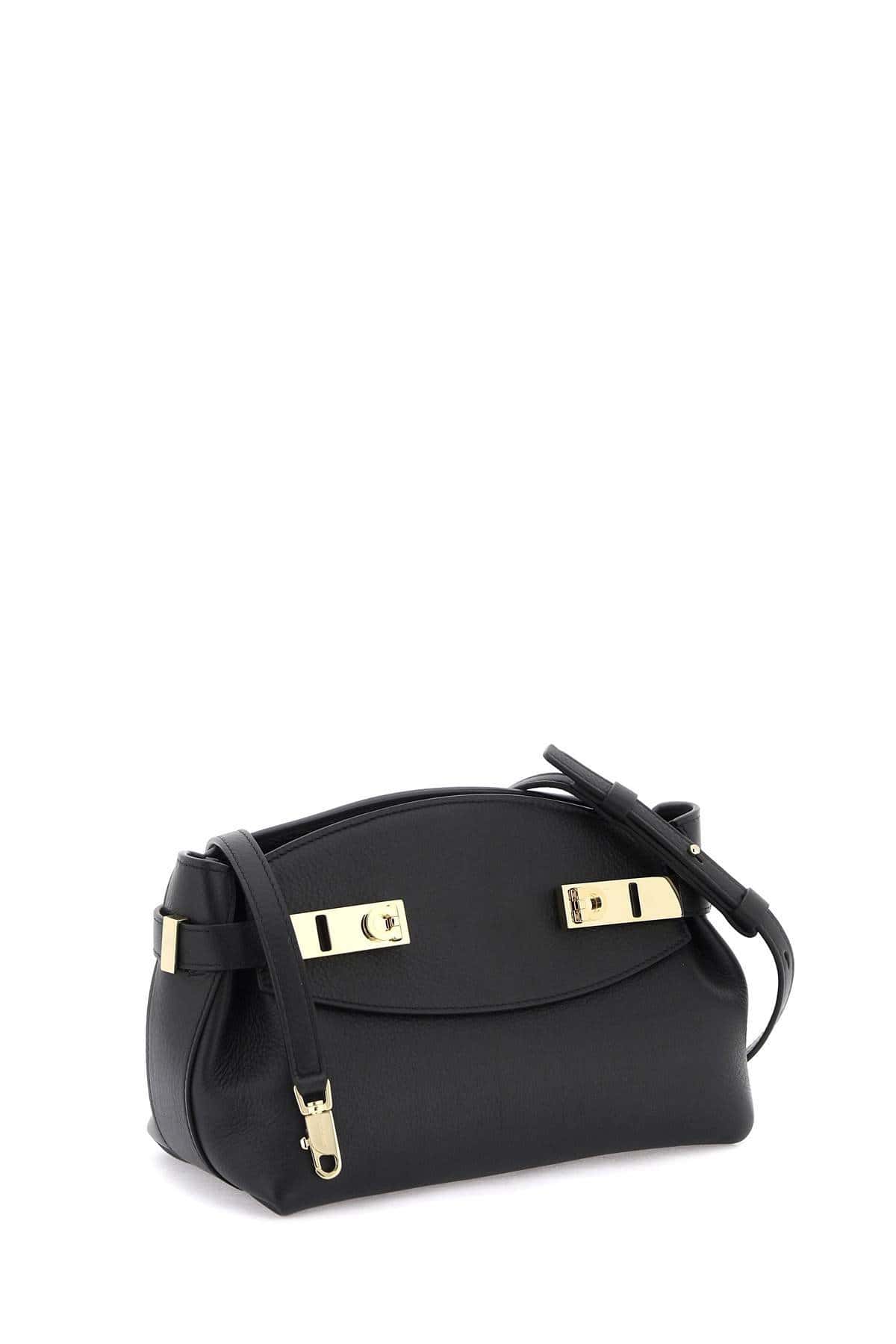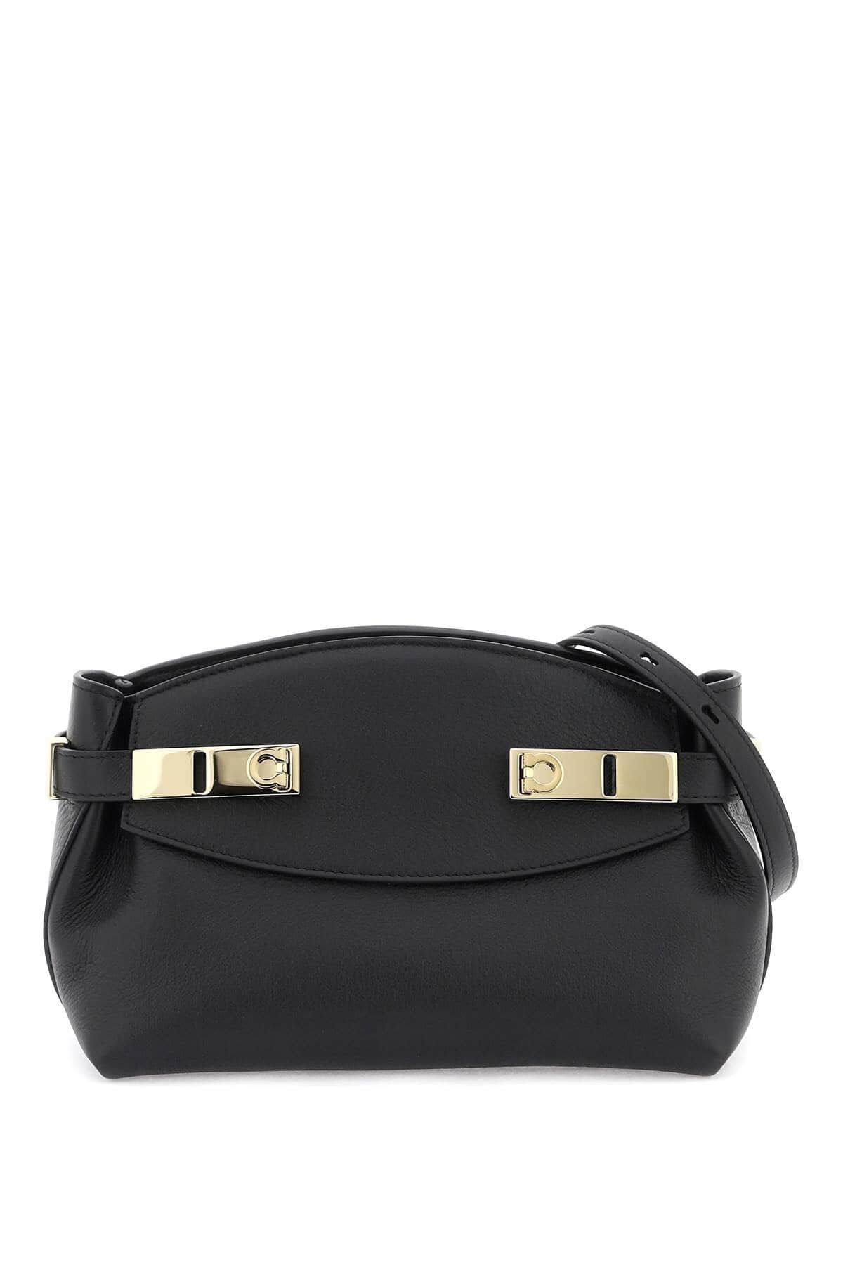 Ferragamo bag crafted in smooth calf letaher with removable adjustable leather strap and iconic Gancini buckles in gold-tone metal on the front. Model with a rounded line featuring hidden magnetic closure and leather interior with double card slot. Gold-tone finish metalware.