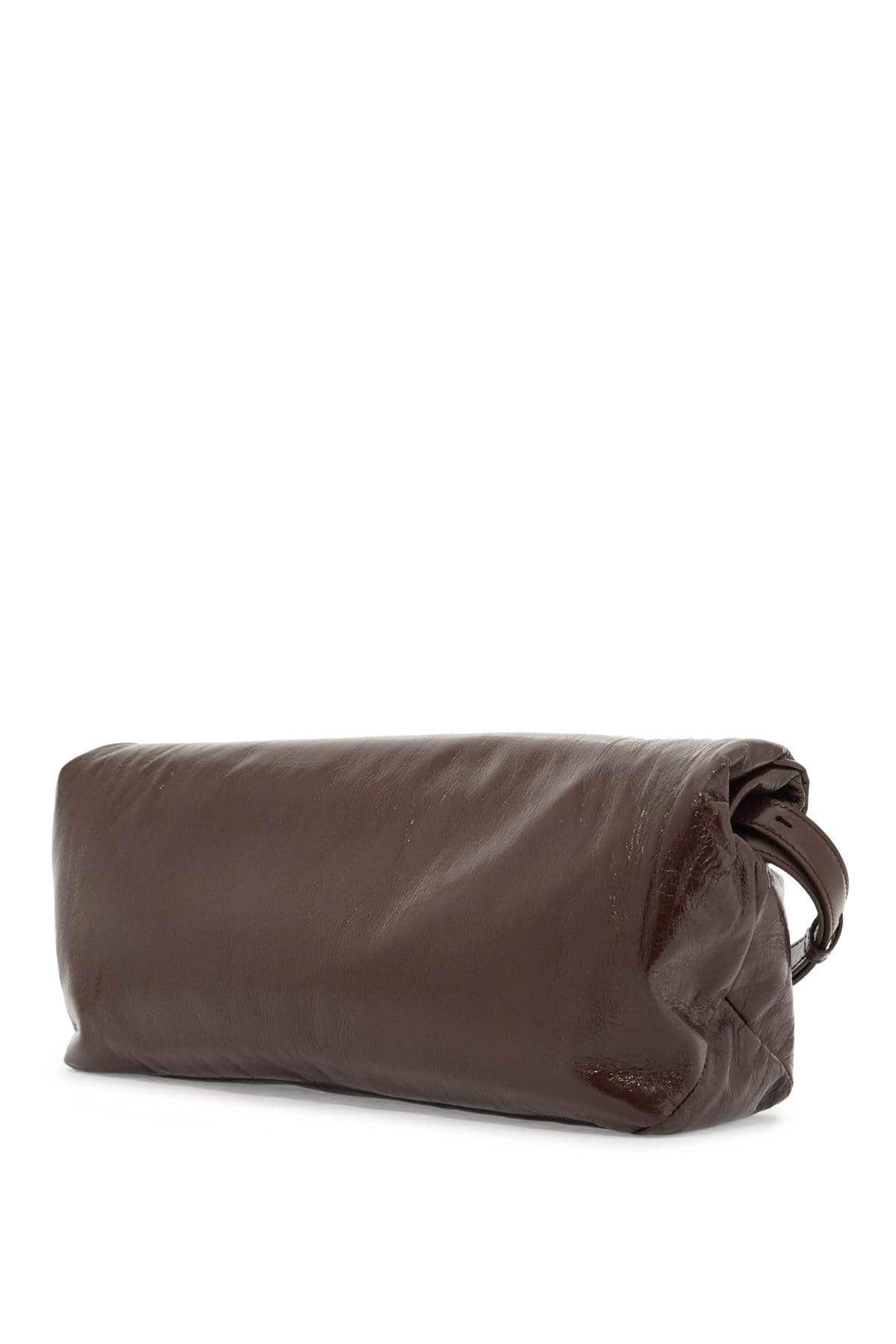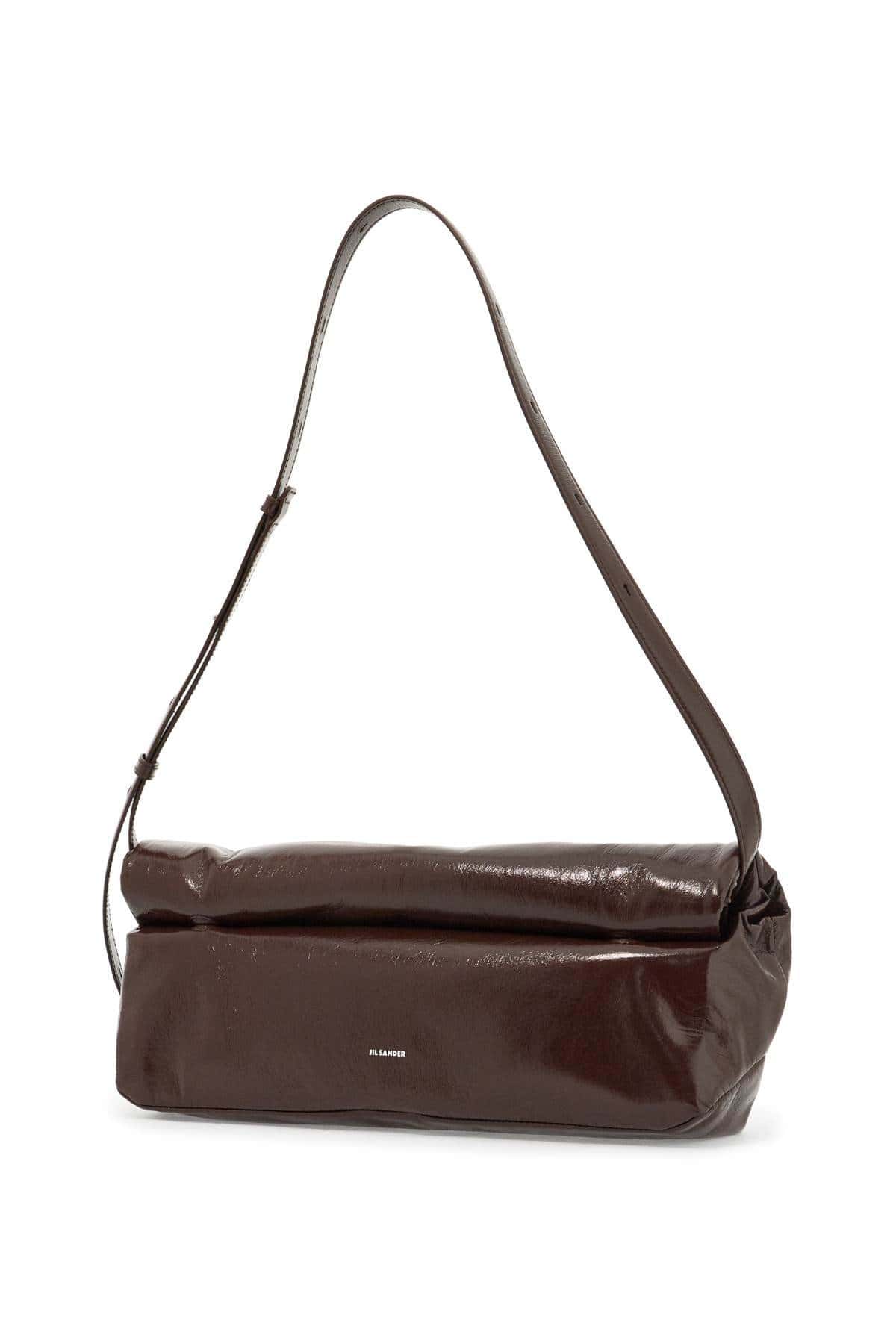 The Jil Sander Rollup media bag is made of glossy leather with a small silver lettering logo on the front and a magnetic rollup closure. The interior is lined with one internal pocket and an adjustable handle.
