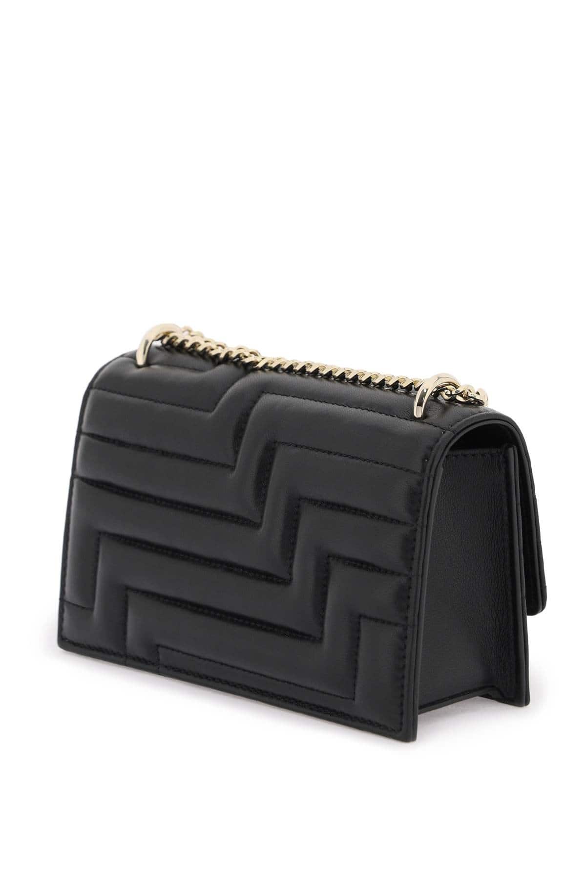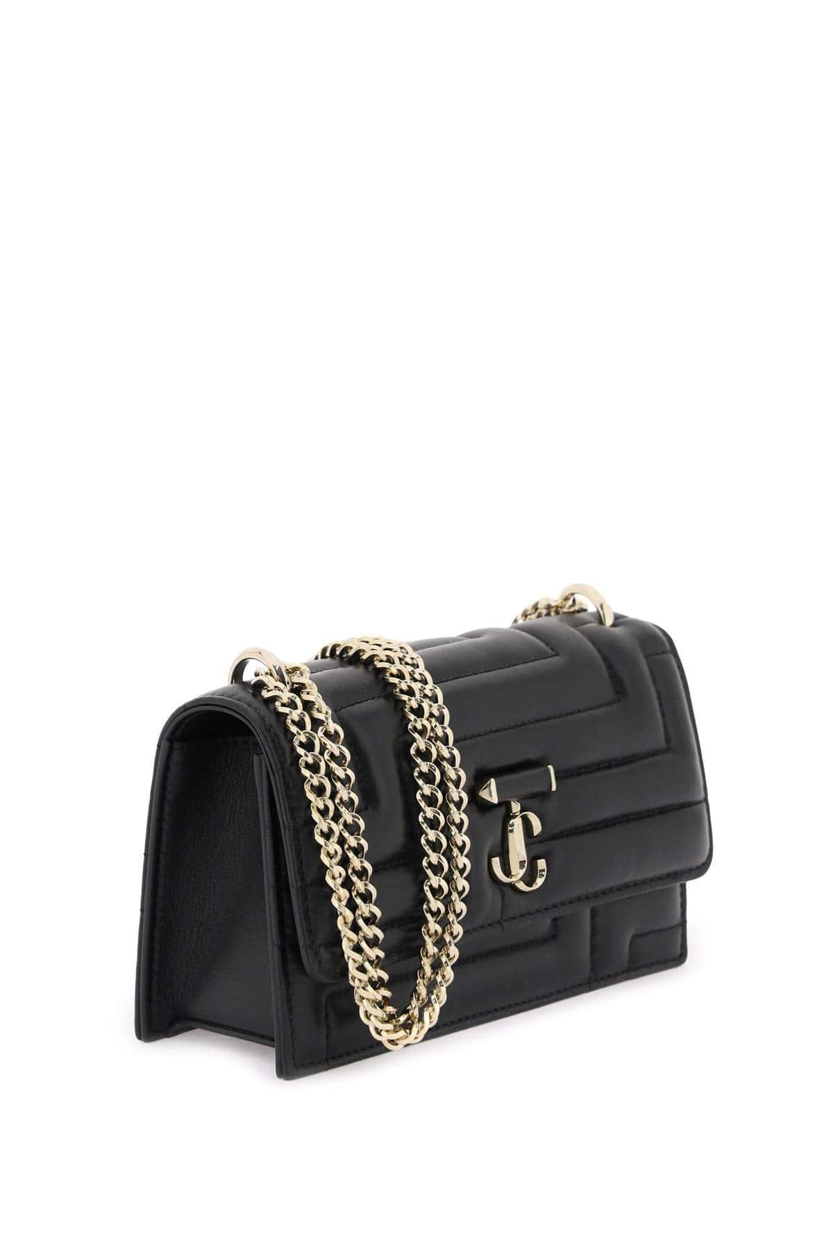 Bohemia mini shoulder bag by Jimmy Choo made of nappa leather with iconic Avenue pattern all-over. Completed with JC monogram on the flap, features magnetic closure, suede interior with three card slots. Chain shoulder strap, gold-tone metalware.