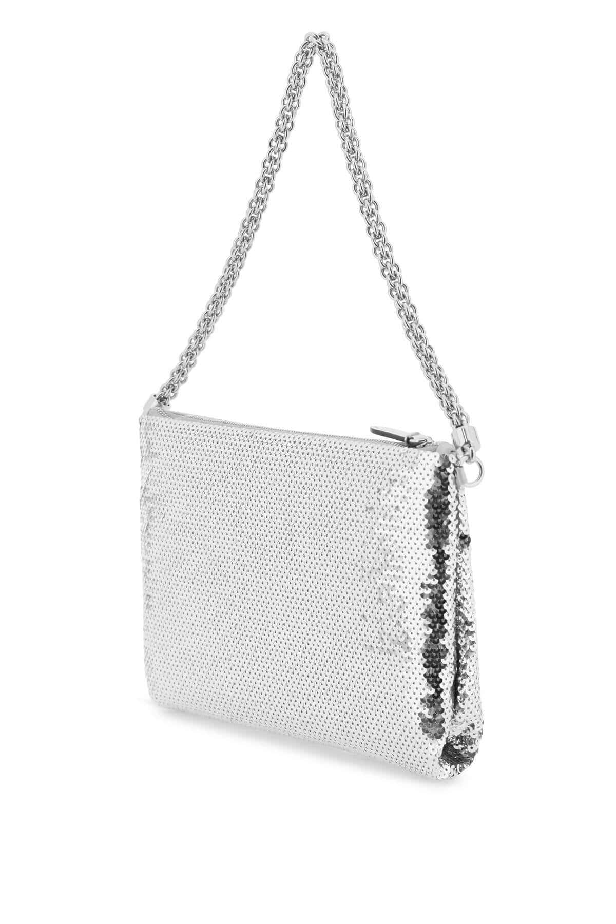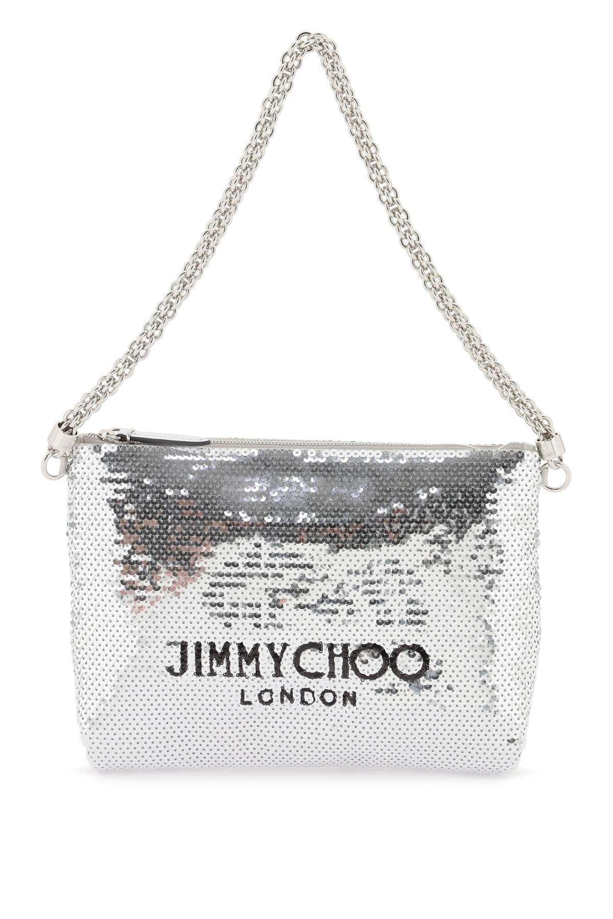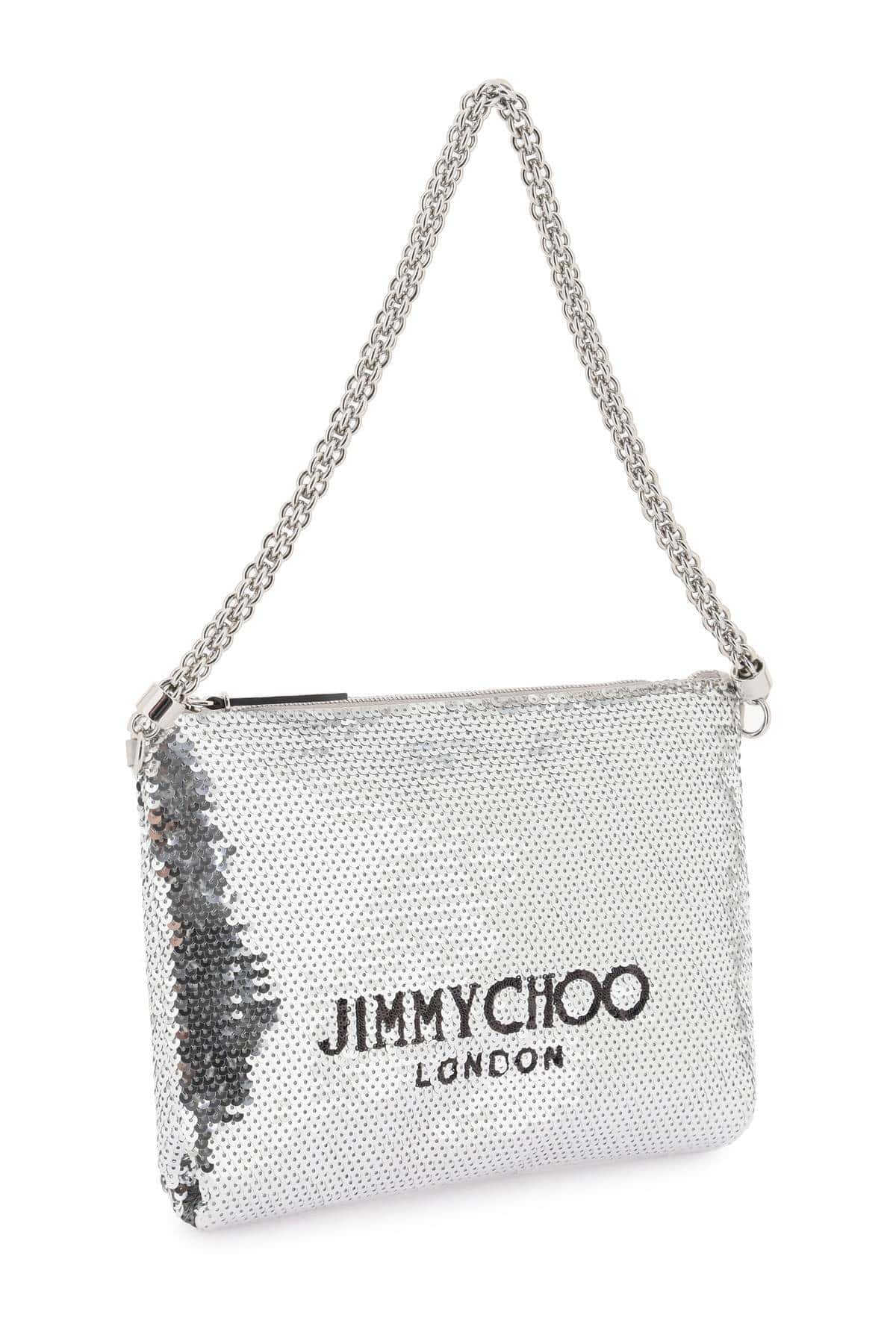 The Callie shoulder bag by Jimmy Choo is made entirely of sequins with contrasting logo lettering. It features a chain handle, zip closure, and a satin-lined interior. The metallic accessories have a silver finish.