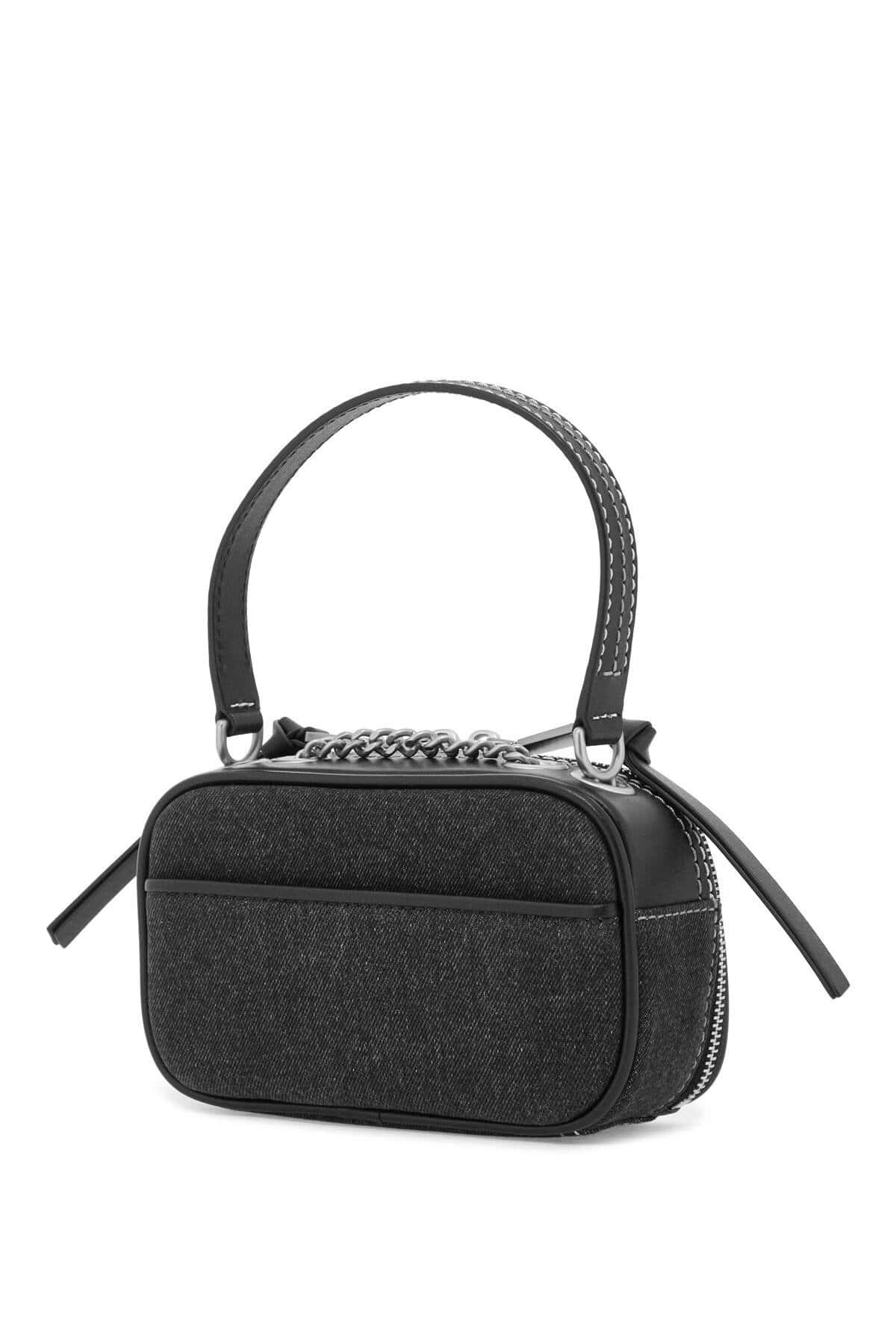 The Denim Chain Snapshot Camera Bag by Marc Jacobs is made of pure cotton denim with a dark wash, embellished with contrasting leather details and the iconic J Marc logo embroidered on the front. It features a zip-around closure with knotted leather straps, a denim interior, a flat pocket on the back, and a sliding chain shoulder strap with stitched leather insert that can be converted into a double handle. The accessories are finished in matte silver metal.