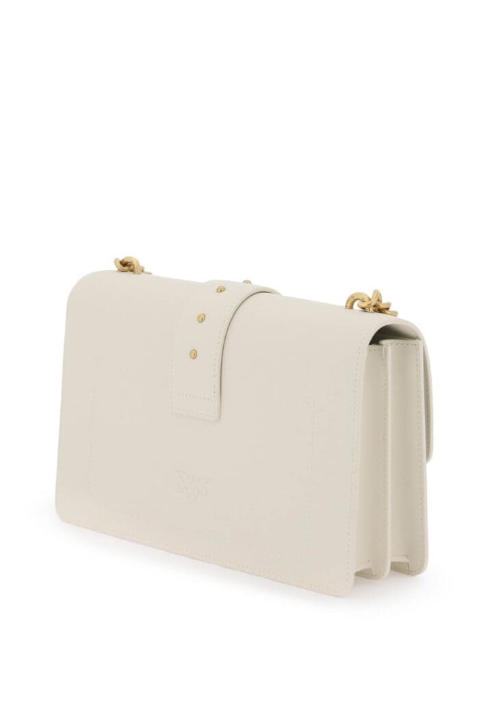 Classic Love Icon Simply bag by Pinko crafted in smooth calf leather and characterized by the front flap with Love Birds metal buckle and rounded studs. Removable and adjustable leather shoulder strap with side chain inserts, joint closure and Birds embroidery on the back. Interior lined in suede microfibre with one leather flat pocket and two compartments divided by a middle zipped pocket. Antique gold-finished metalware.
