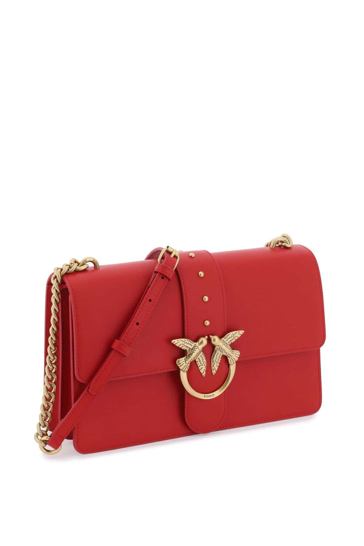 Classic Love Icon Simply bag by Pinko crafted in smooth calf leather and characterized by the front flap with Love Birds metal buckle and rounded studs. Removable and adjustable leather shoulder strap with side chain inserts, joint closure and Birds embroidery on the back. Interior lined in suede microfibre with one leather flat pocket and two compartments divided by a middle zipped pocket. Antique gold-finished metalware.
