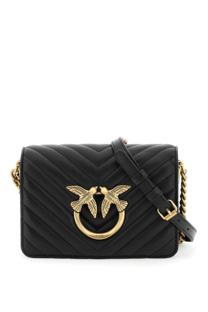 Mini Love Click bag by Pinko crafted in nappa leather with chevron quilting and characterized by the front flap with rounded cut-out enriched by the iconic metal Love Birds buckle with engraved logo. Magnetic closure and chain shoulder strap with adjustable leather insert. Interior lined in microfiber suede with a flat leather pocket and two compartments divided by a central zip pocket. Antique gold finished metalware.