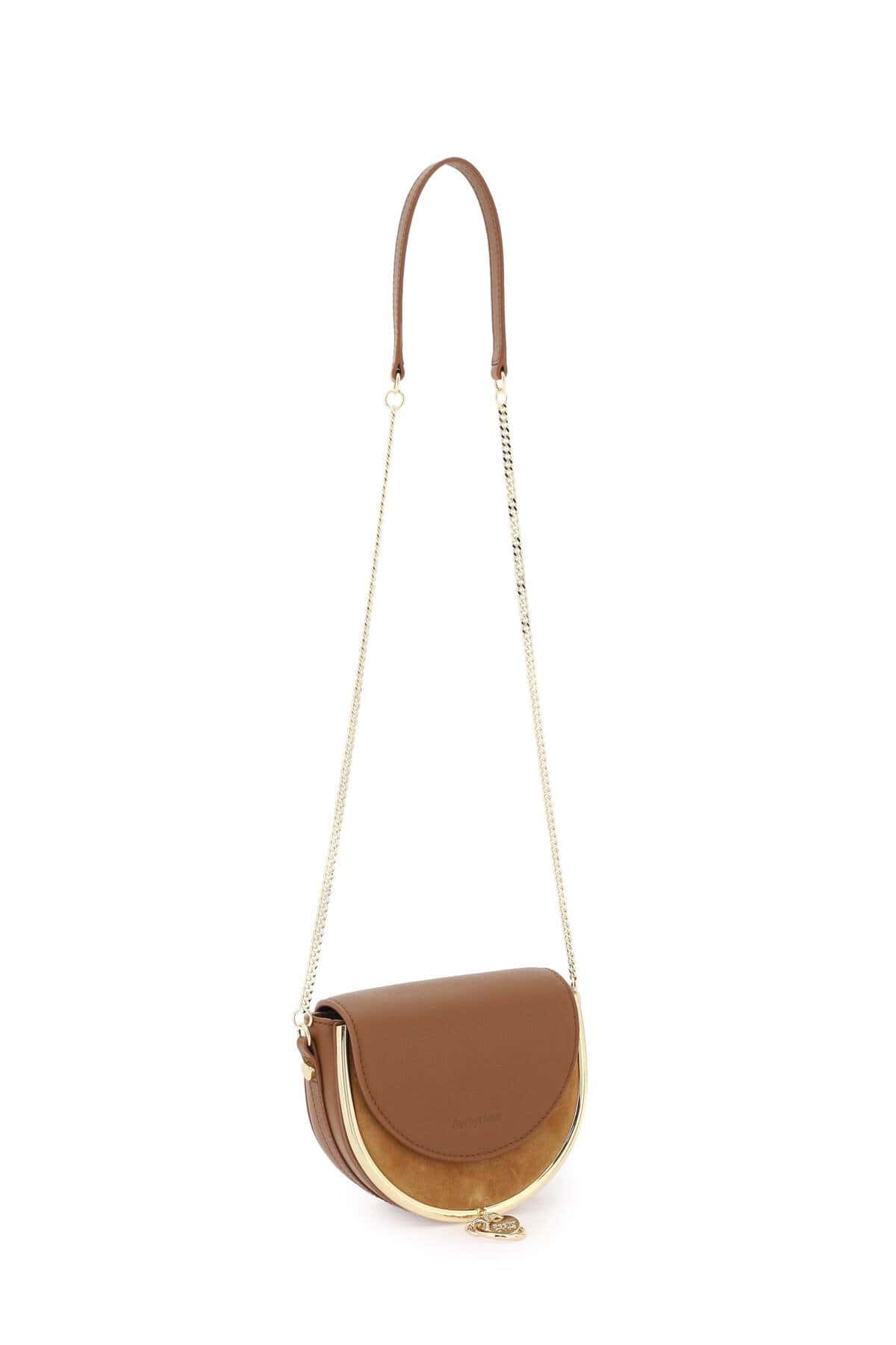 Mara crossbody bag from See By ChloƩ made of smooth leather and suede with gold metal detail and charms. Magnetic closure, fabric interior with one flat open pocket and chain shoulder strap with leather insert. Gold-finish metalware.