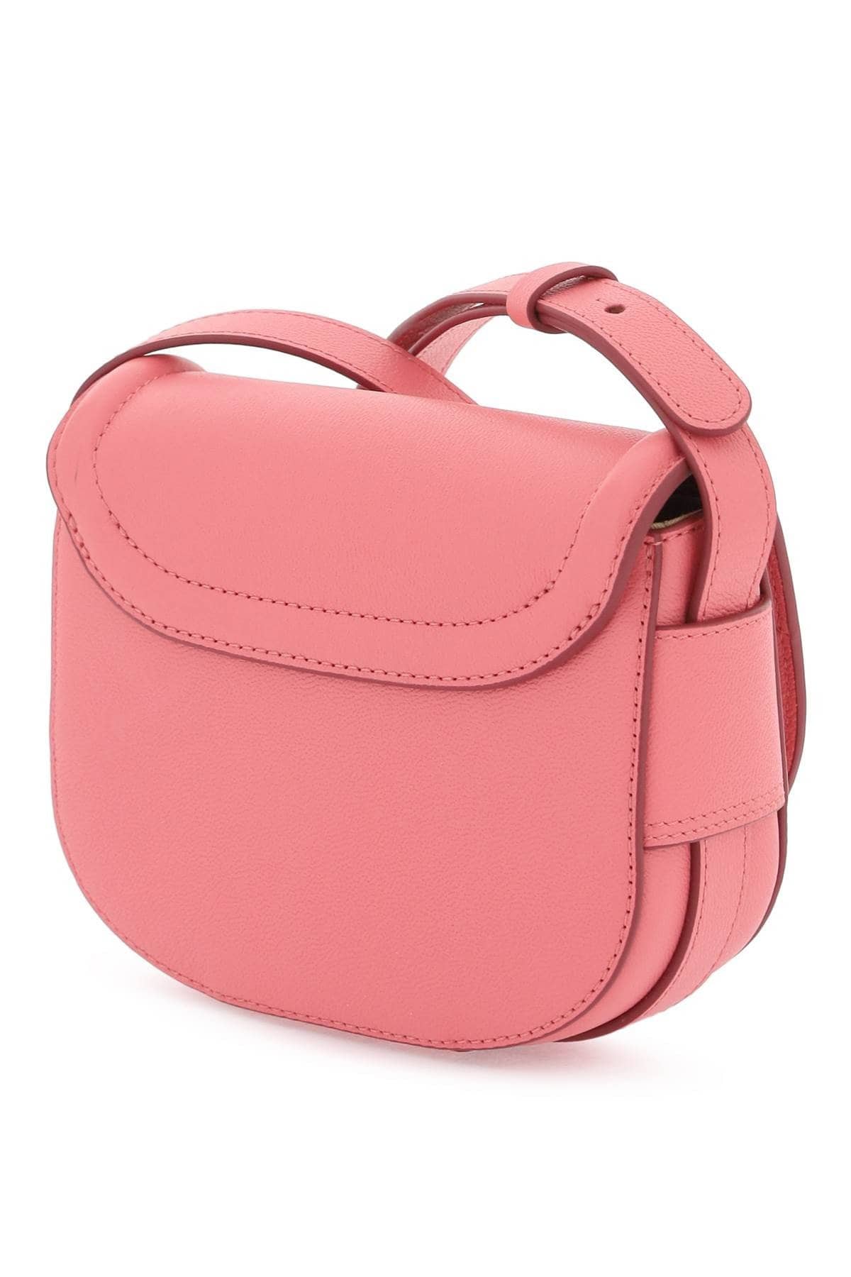 See By ChloƩ grain leather bag with large ring and logo charm on the flap. It features an adjustable strap, magnetic closure, embossed logo on the front, fabric lining, inside flat pocket, gold-tone hardware.
