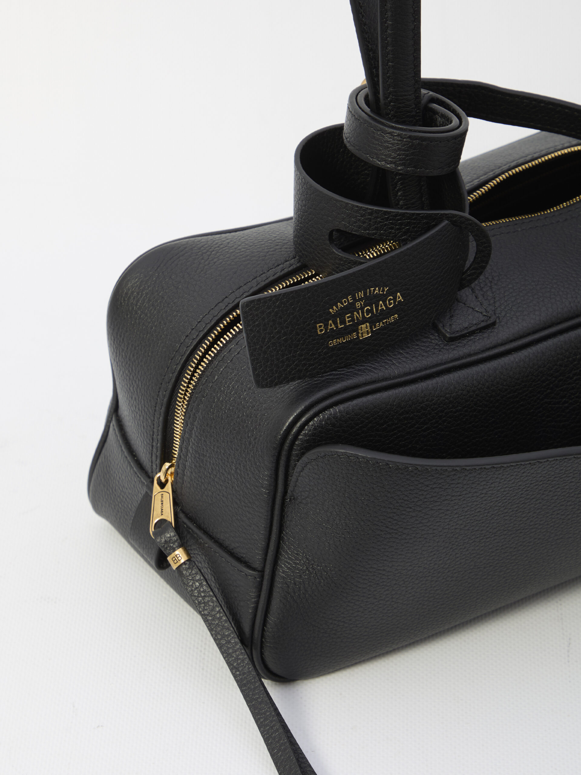 Black grenadine calfskin bag. It features two top handles with a clip, a removable travel tag, metal feet, a large front pocket with an embossed logo, double-zip closure with leather zipper pulls, one main compartment, an internal zip pocket, lambskin lining, and antiqued gold hardware. Dustbag included. Any imperfections in the leather should not be considered manufacturing defects, but rather a peculiarity of the material.