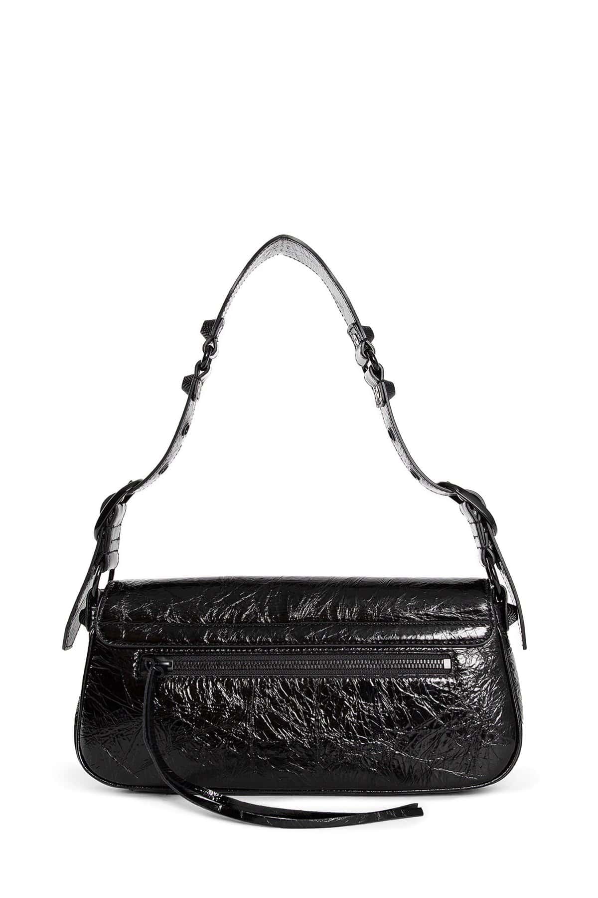 Nero Arena nappa leather Enamelled metal pins and buckles Adjustable shoulder strap Flap with studded magnet closure Cotton canvas lining Front and back zipped pockets with knotted leather pulls