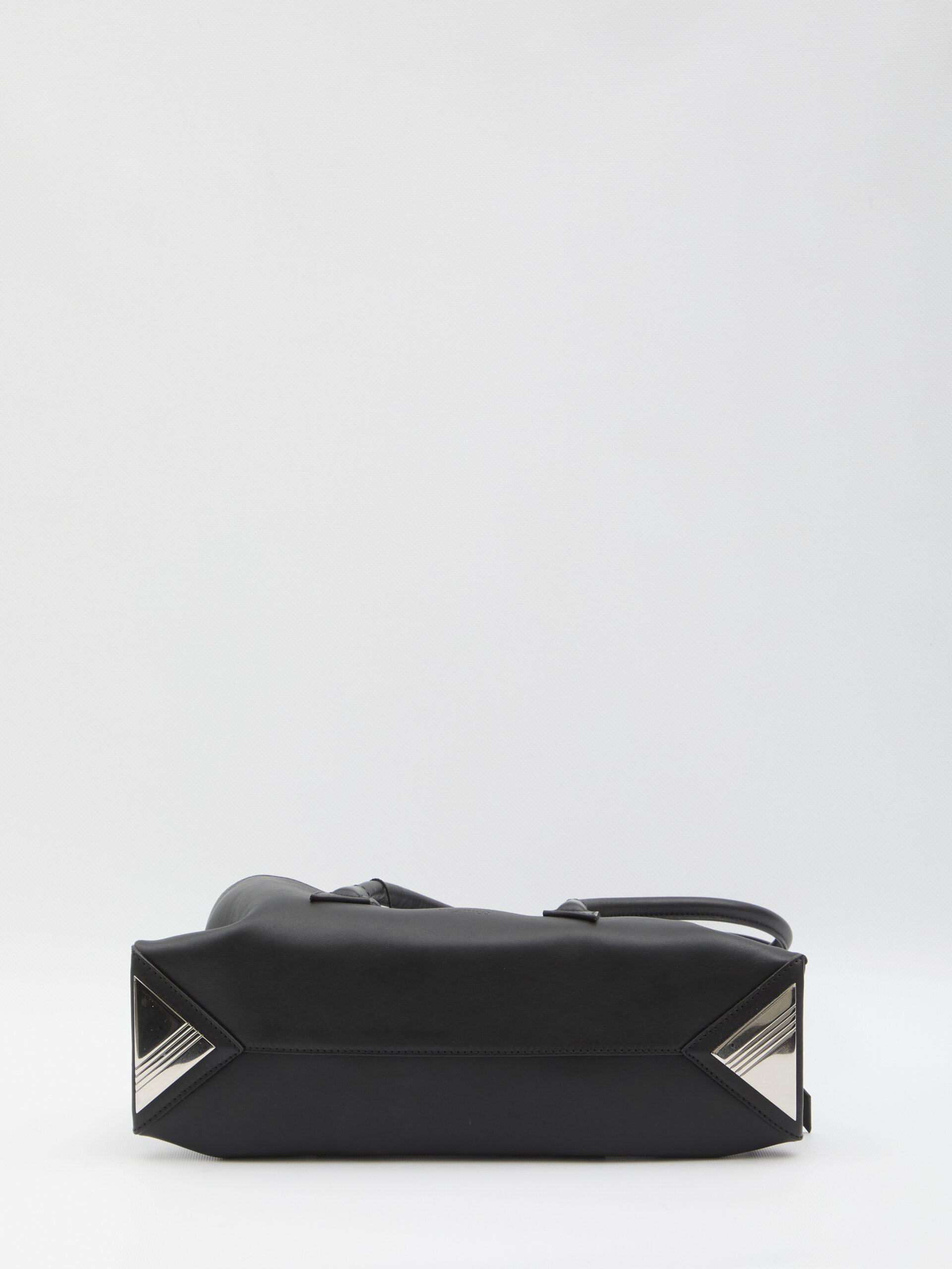 Black calfskin leather bag. It features an asymmetric design, two tubular top handles, a zip closure, one main compartment, and metal feet. Dustbag included. Any imperfections in the leather should not be considered manufacturing defects, but rather a characteristic of the material.