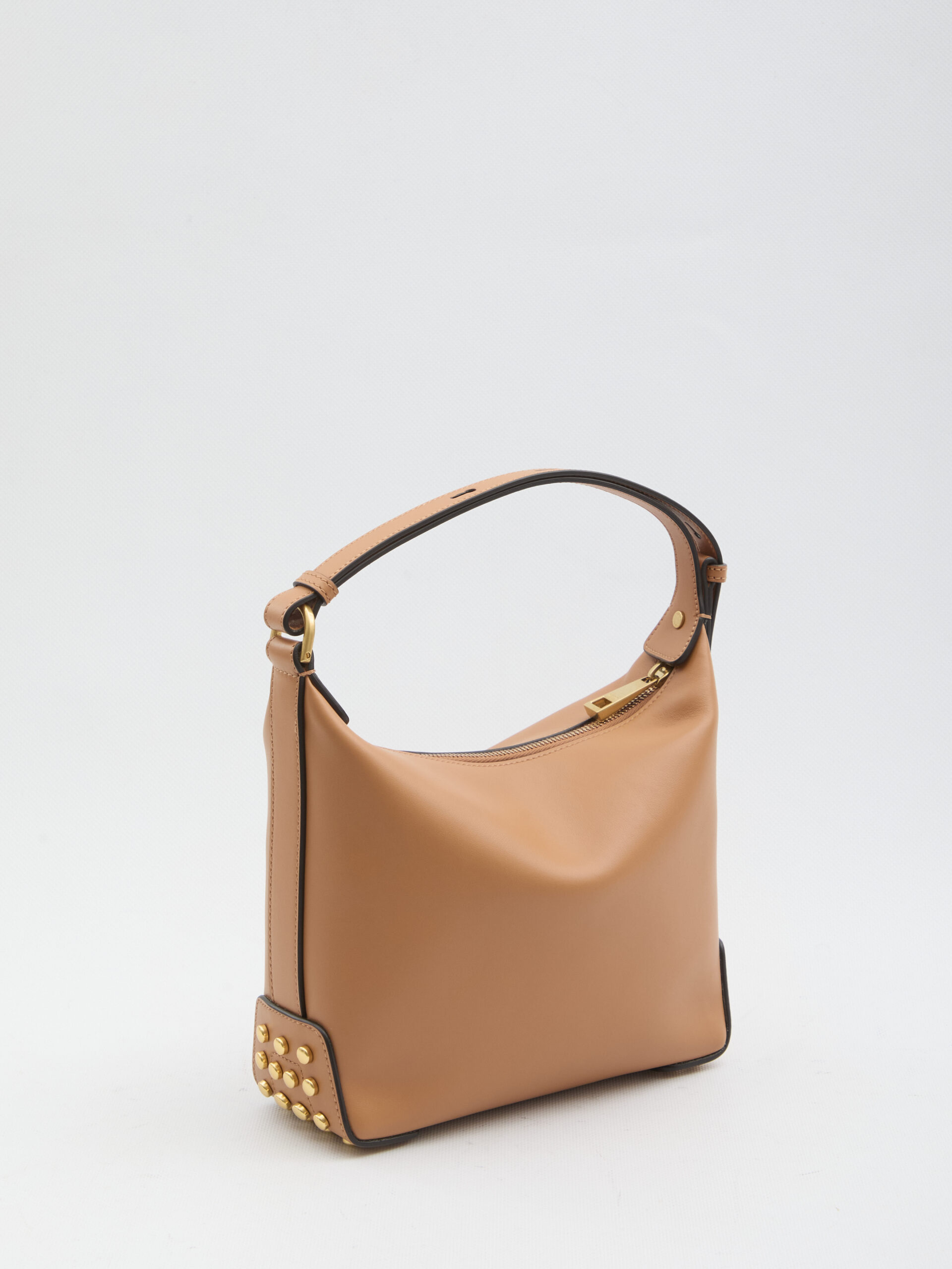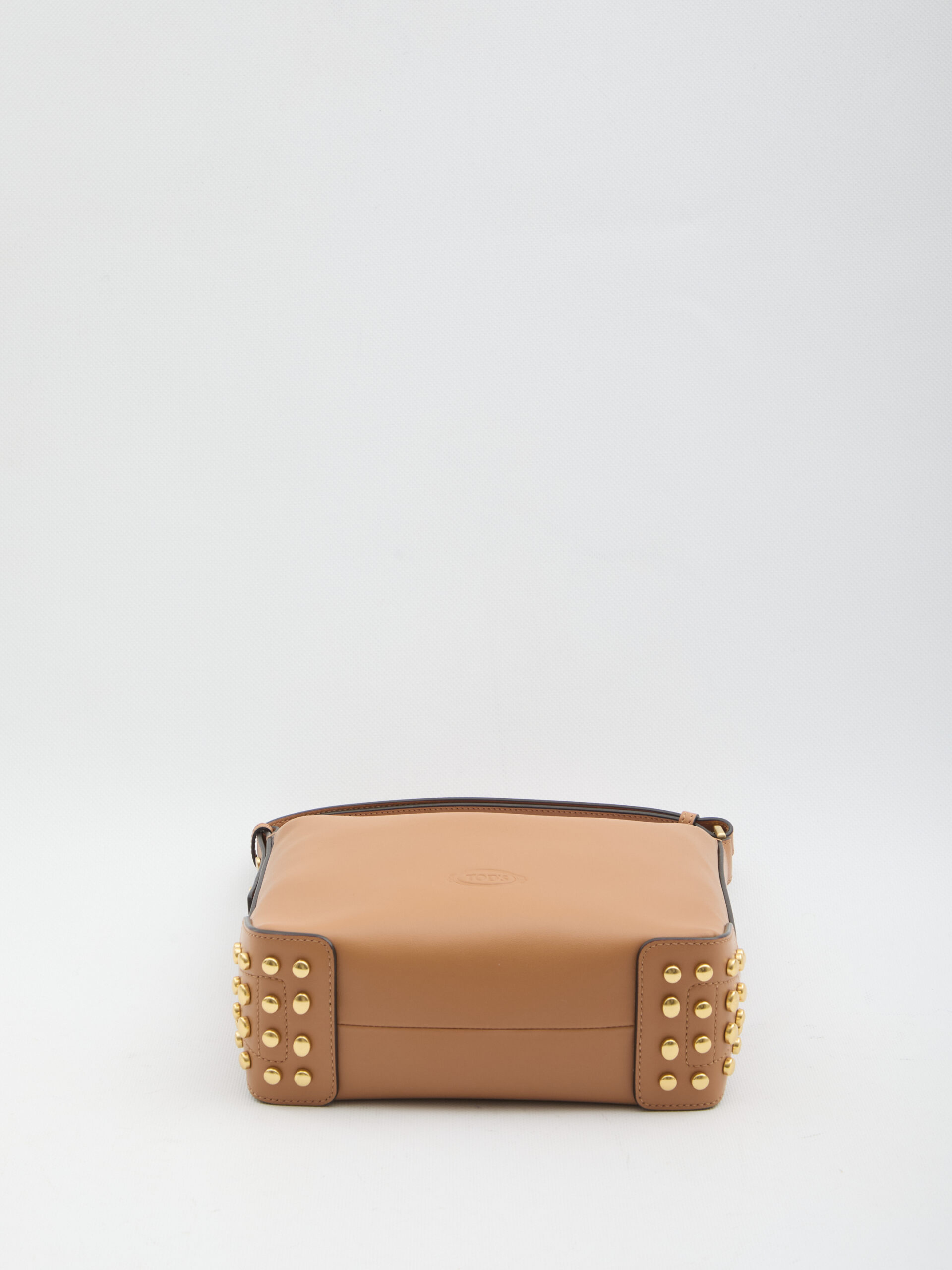 Brown smooth leather bag. It features an adjustable top handle, side stud detailing, an embossed Tod’s logo on the front, a zip closure, one main compartment, and a suede leather lining. Dust bag included. Any leather imperfections are not to be considered manufacturing defects, but a characteristic of the material.