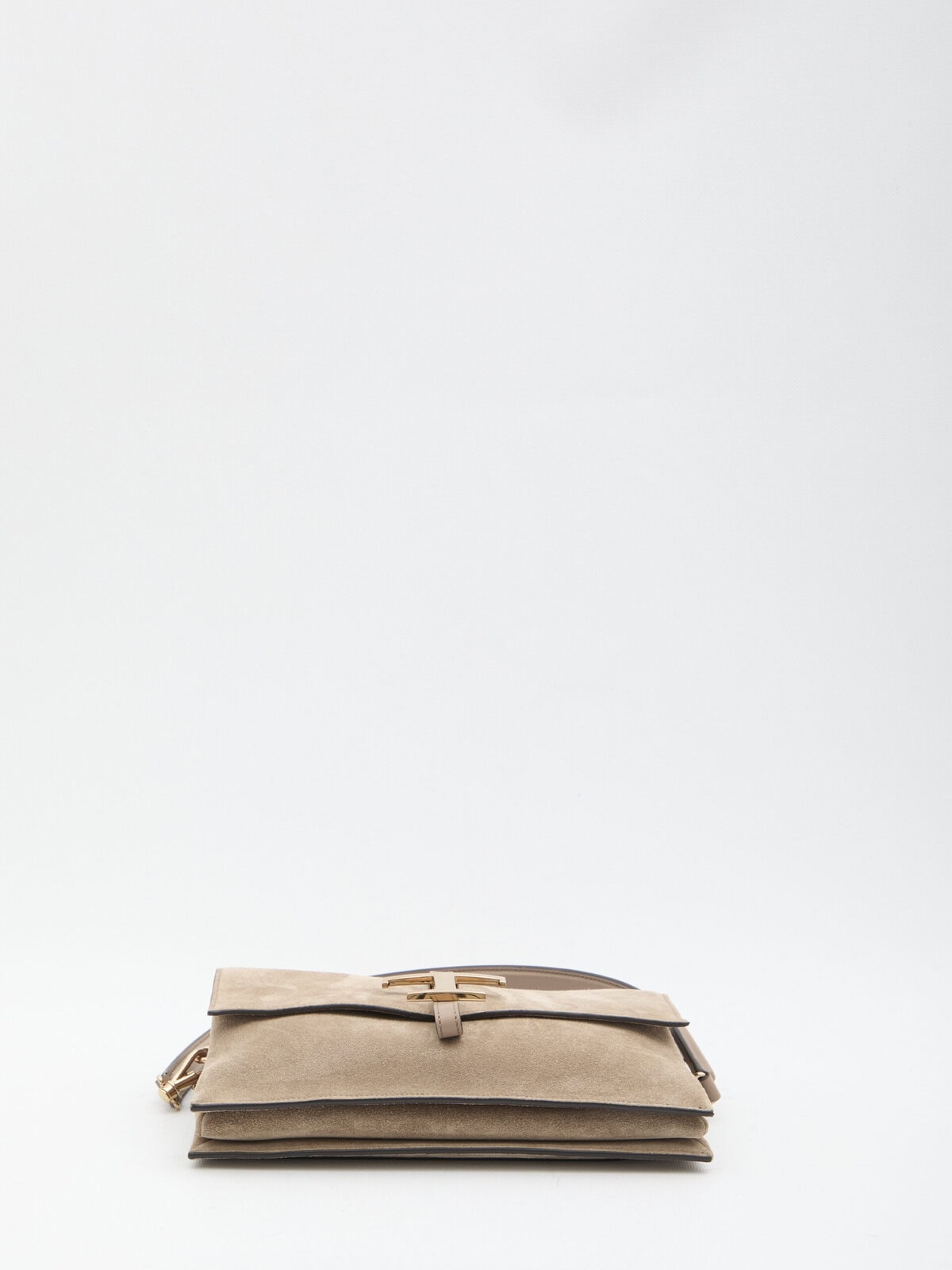 Taupe suede leather bag. It features a fixed handle, adjustable and removable shoulder strap, custom metal T Timeless accessory, magnetic closure, suede interior with three compartments, card slots pocket, and a flat pocket on the back. Dustbag included. Any imperfections in the leather are not considered manufacturing defects, but a characteristic of the material.