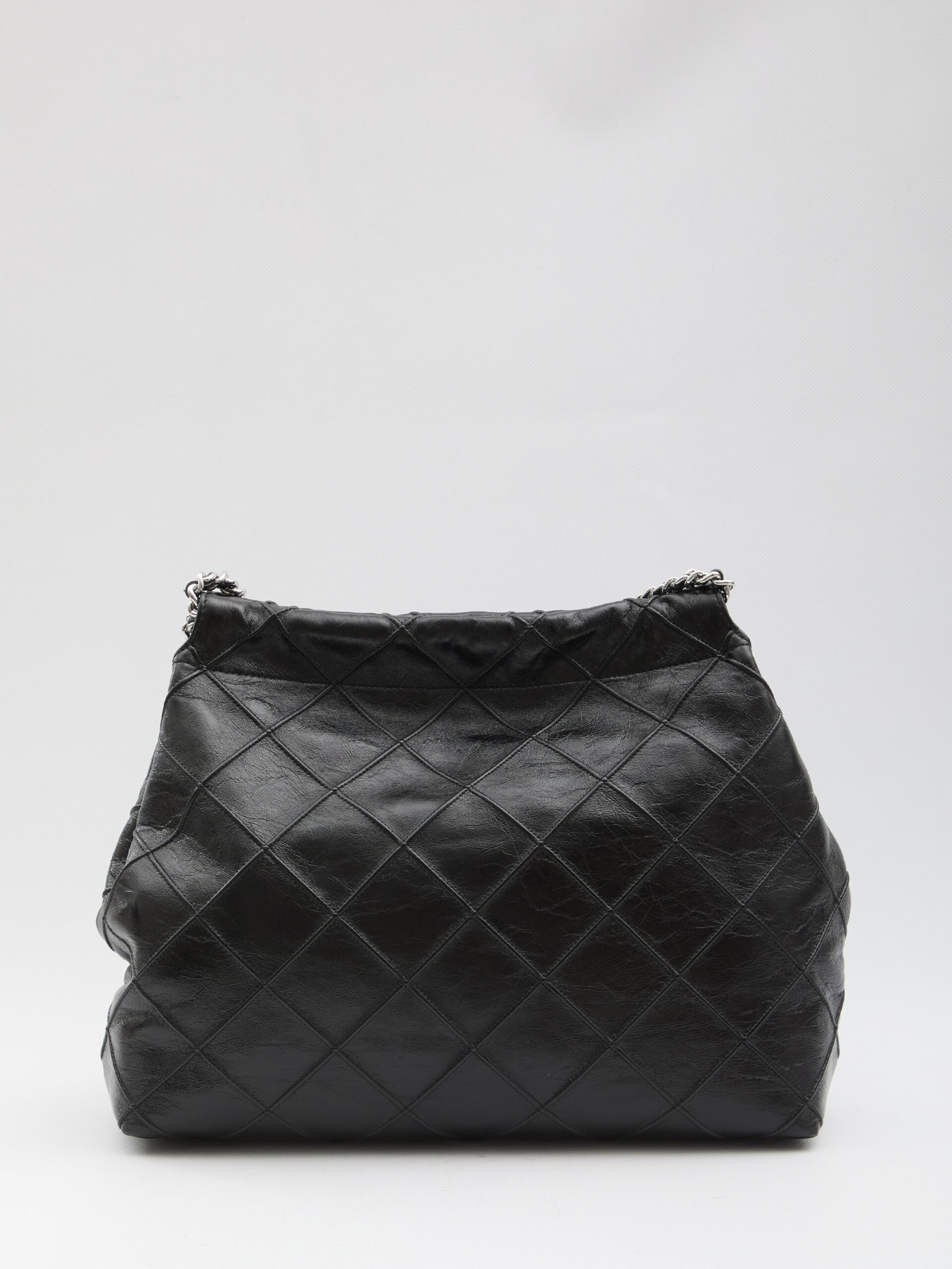 Black quilted wrinkled nappa leather bag. It features intertwined double chain and leather handles, a logo charm, magnetic closure, one main compartment with one zippered pocket and one flat pocket inside, and technical fabric lining. Aged effect. Dustbag included. Any imperfections in the leather are not considered manufacturing defects, but a characteristic of the material.