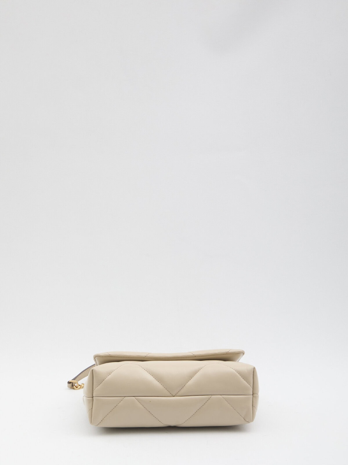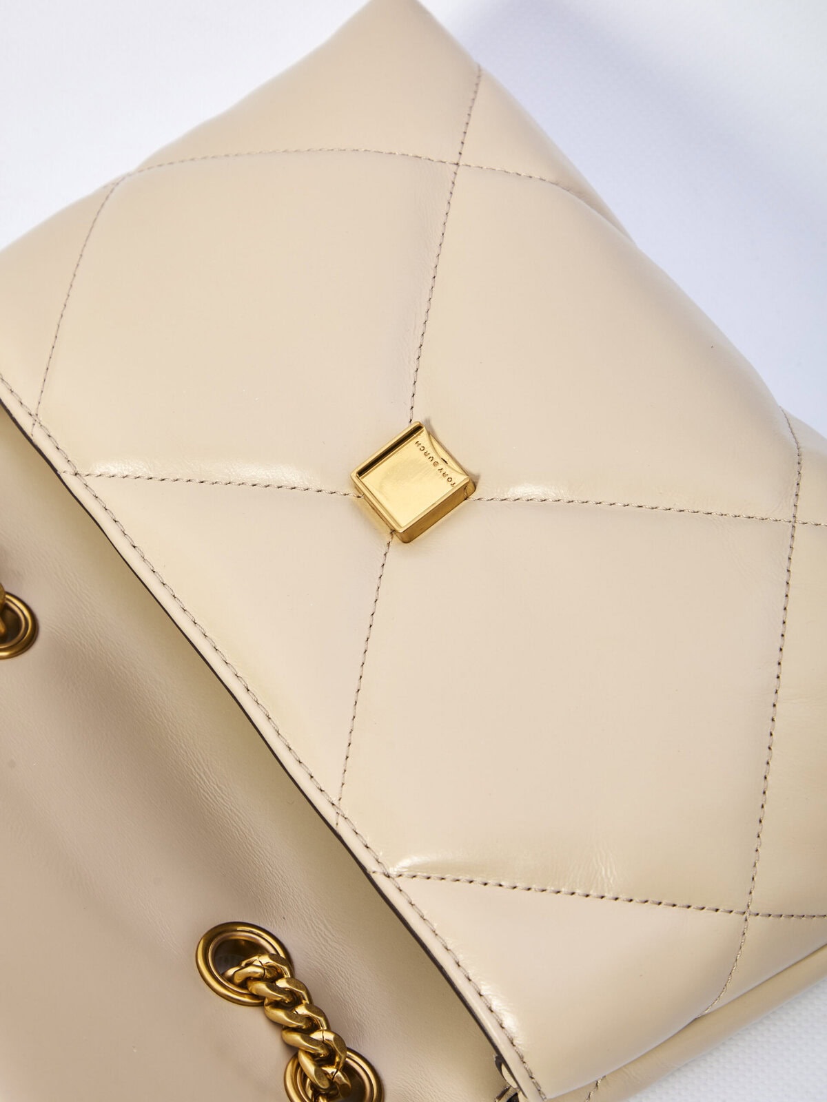 Kira Diamond Quilt Small Convertible bag in Light Stone beige quilted leather. It features a double T metal logo in gold on the front, a sliding leather and chain shoulder strap, a magnetic closure, one main internal compartment, an internal zip pocket, and an internal flat pocket. Dustbag included. Any imperfections in the leather should not be considered manufacturing defects, but rather a characteristic of the material.