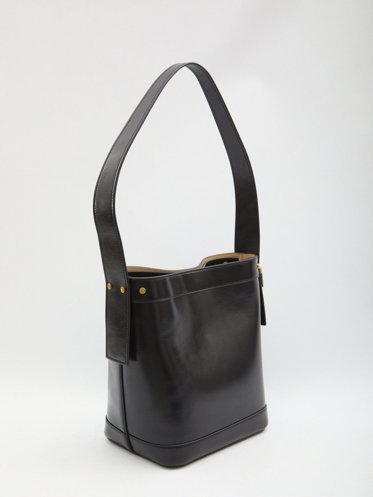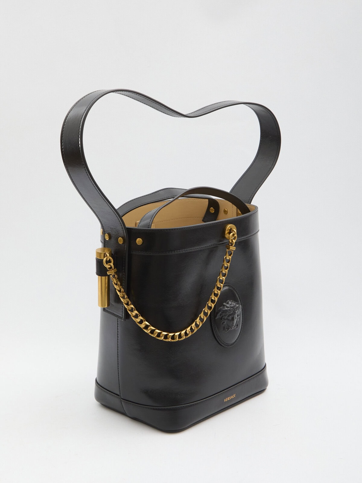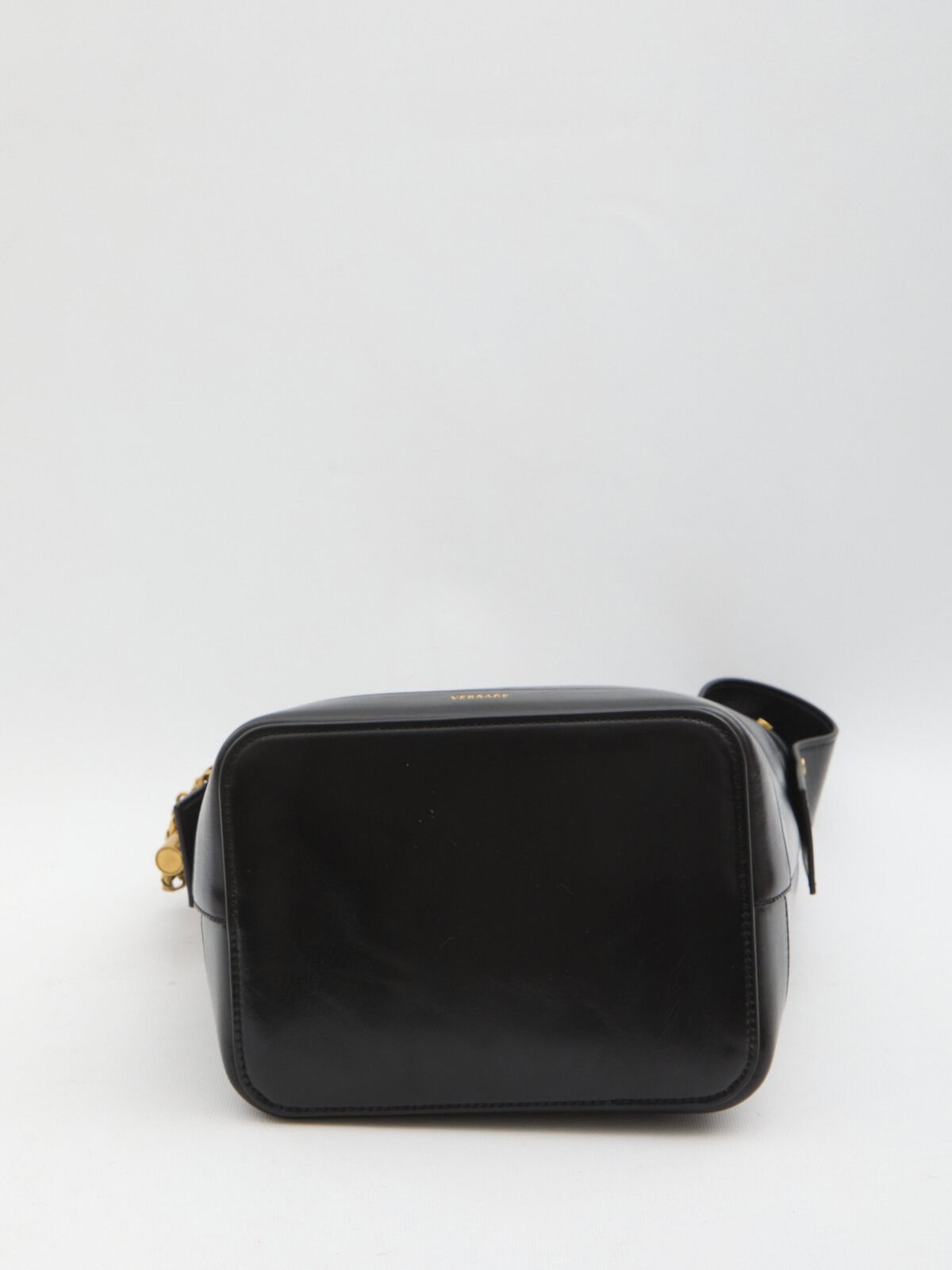 Black grained calfskin leather bag. Features a top handle, tone-on-tone embossed logo on the front, Versace signature on the front and Versace Gold chain detail, two small internal handles, magnetic closure, one main compartment, one flat pocket, leather lining. Dust bag included. Any leather imperfections are not to be considered manufacturing defects, but a characteristic of the material.