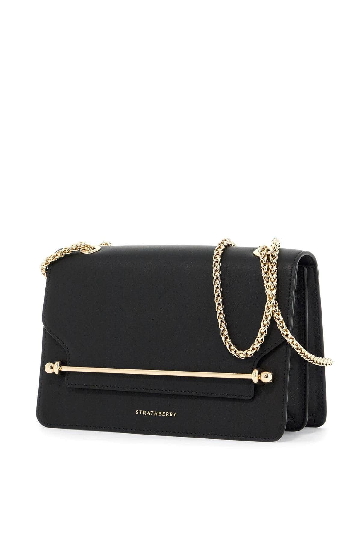 Strathberry East/West bag handcrafted in calf leather with the iconic branded metal bar on the front. Flap with magnetic closure, gold-tone logo print on the front, sliding double-handle tubular chain shoulder strap that can be worn by hand, on the shoulder or crossbody. Interior lined in suede microfiber with a flat pocket and two compartments, gold-tone metal hardware.