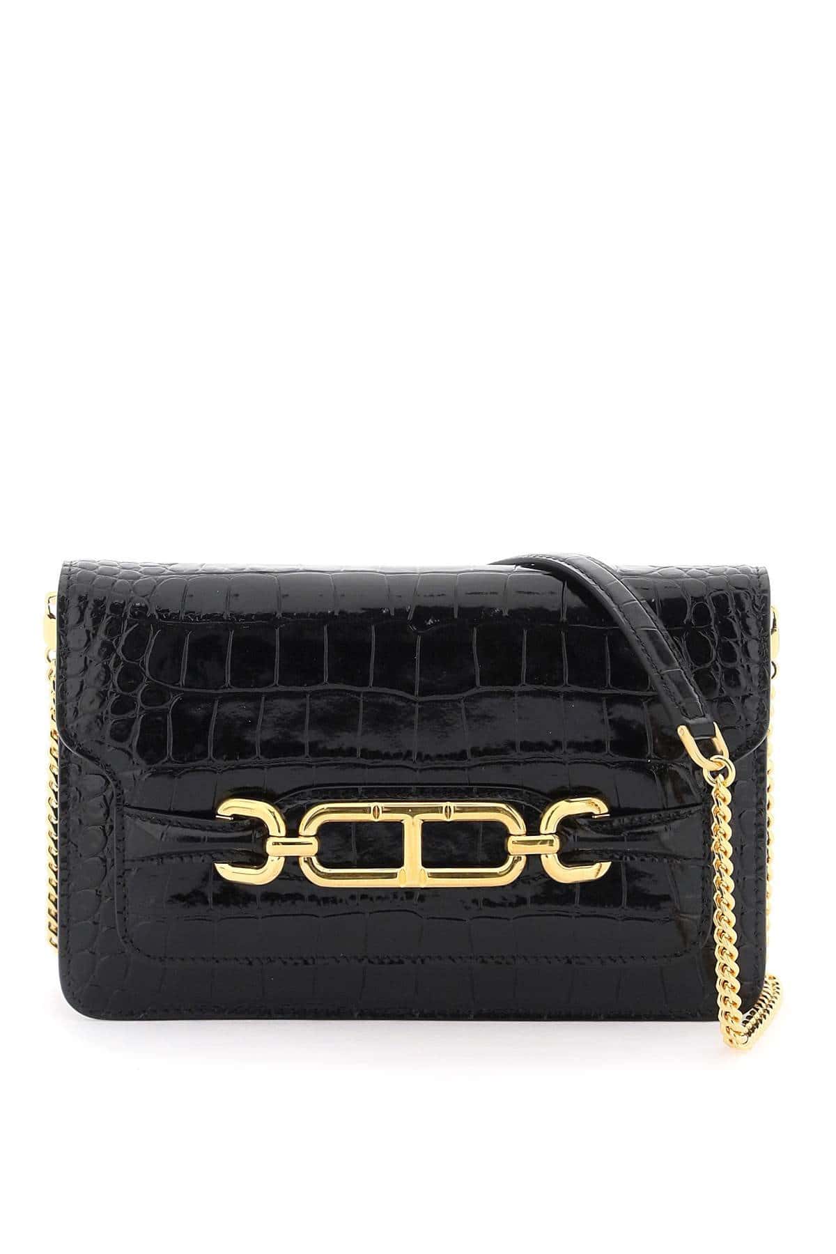 The Whitney shoulder bag by Tom Ford is made of crocodile print leather, embellished with a gold metal detail in the shape of a T. It features a magnetic closure and a smooth leather interior with an open pocket. The removable chain strap has a leather insert for added comfort.