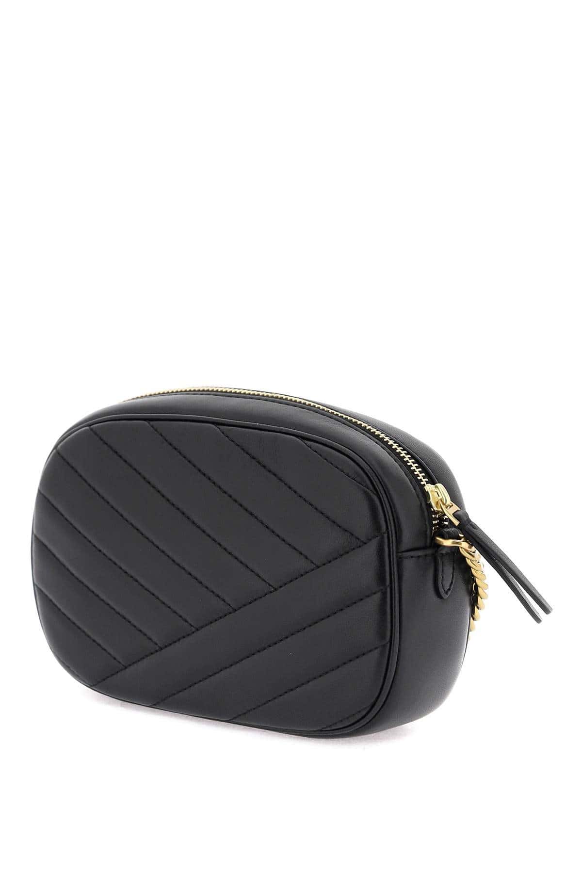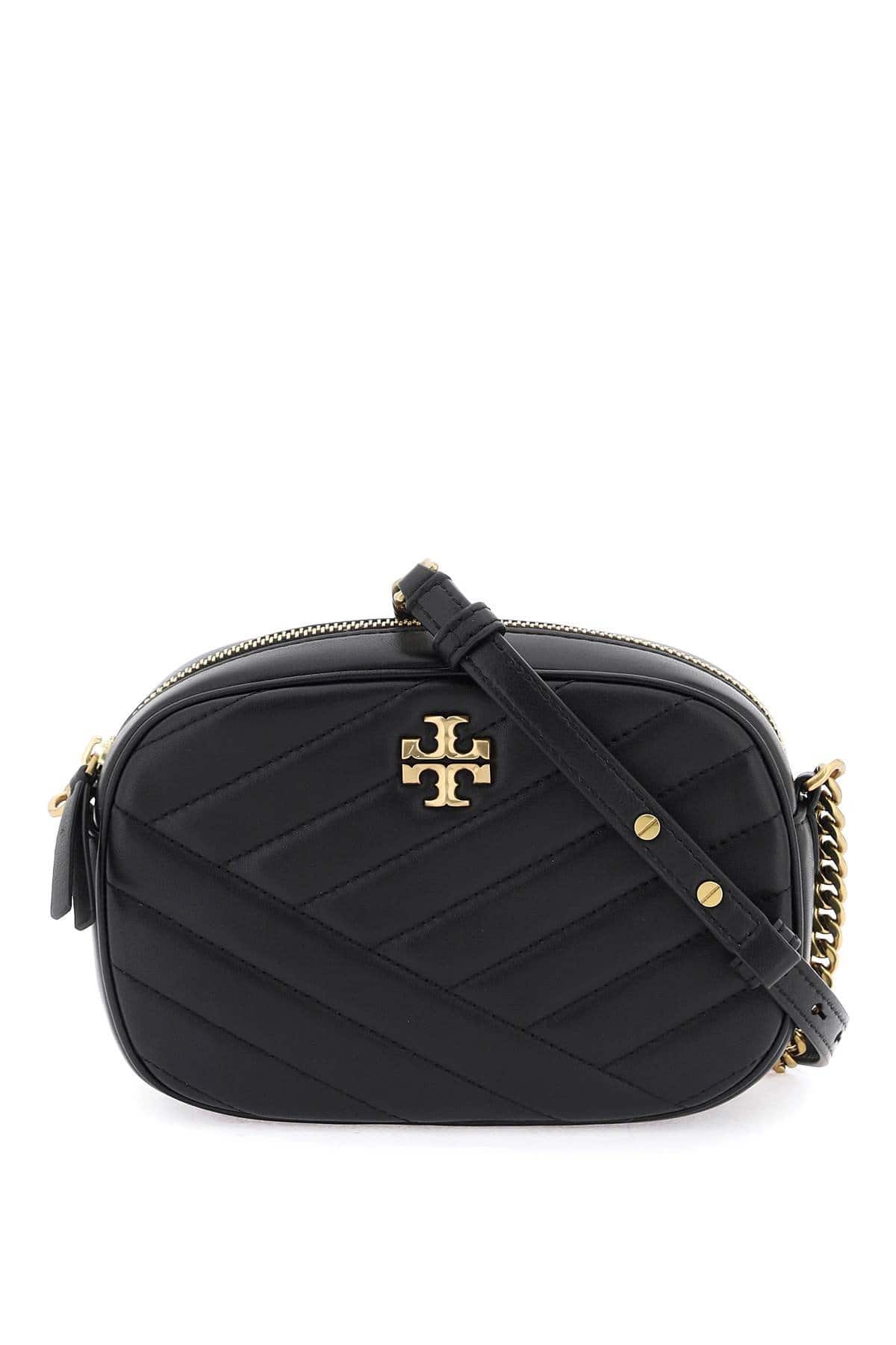 Kira small camera bag by Tory Burch crafted in soft leather with chevron quilting, enriched with the iconic metal double T monogram applied on front. Adjustable leather shoulder strap with side chain inserts, zip closure, fabric-lined interior with a zipped flat pocket and one open pocket. Gold-finished metalware.