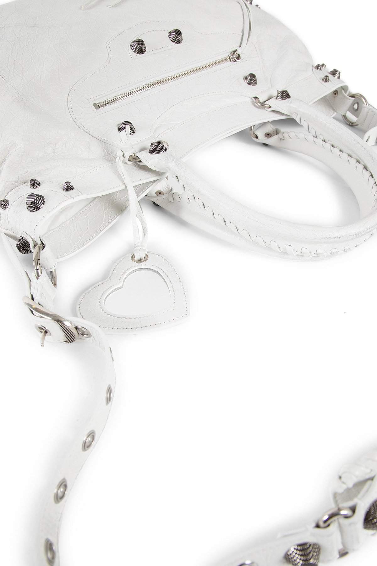 Bianco Arena lambskin Extractable inner trompe l’oeil nylon tote bag Leather hand-braided handles Adjustable and removable shoulder strap Front zipped pocket Removable heart mirror Internal zipped pocket Nylon lining