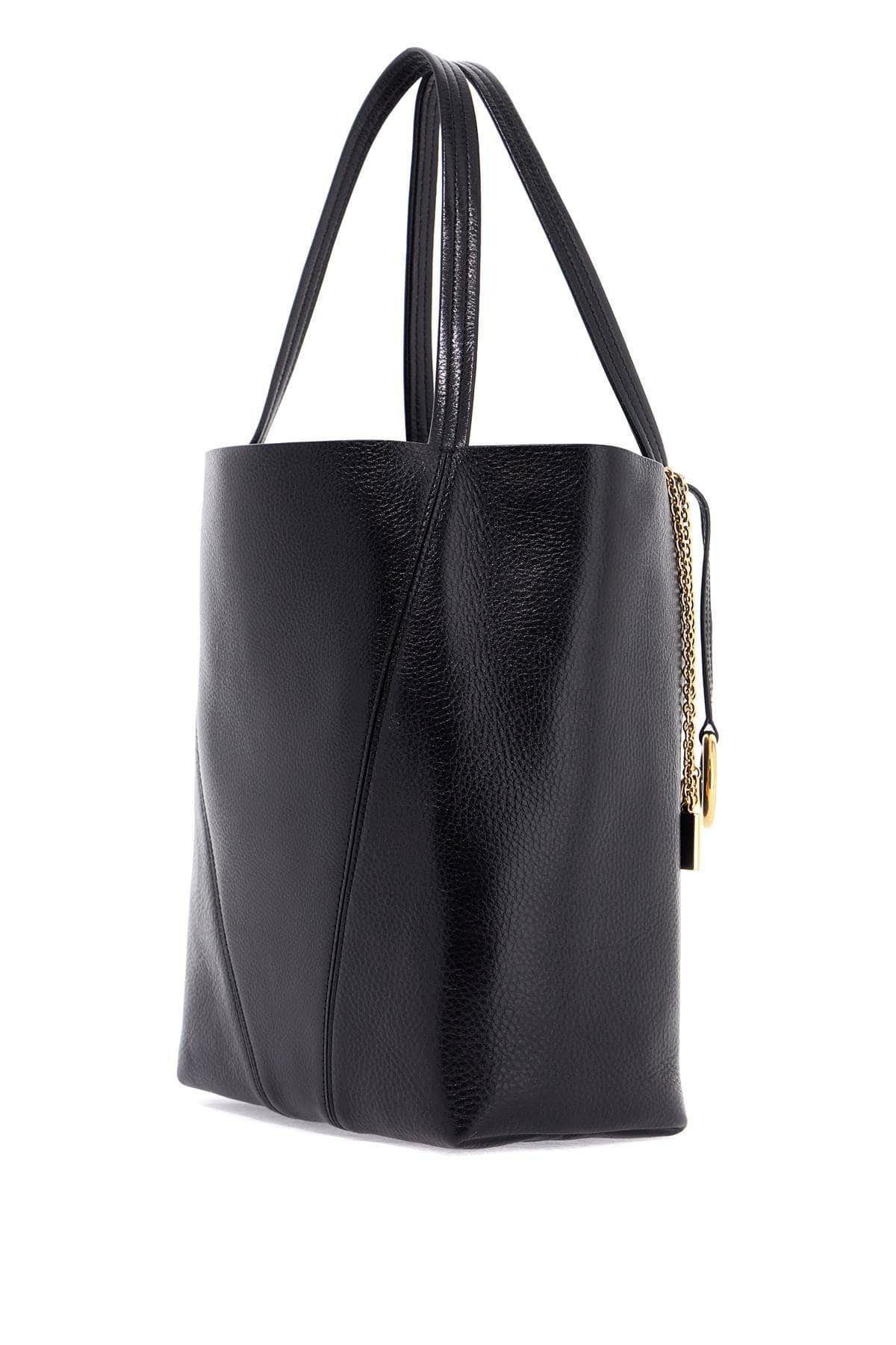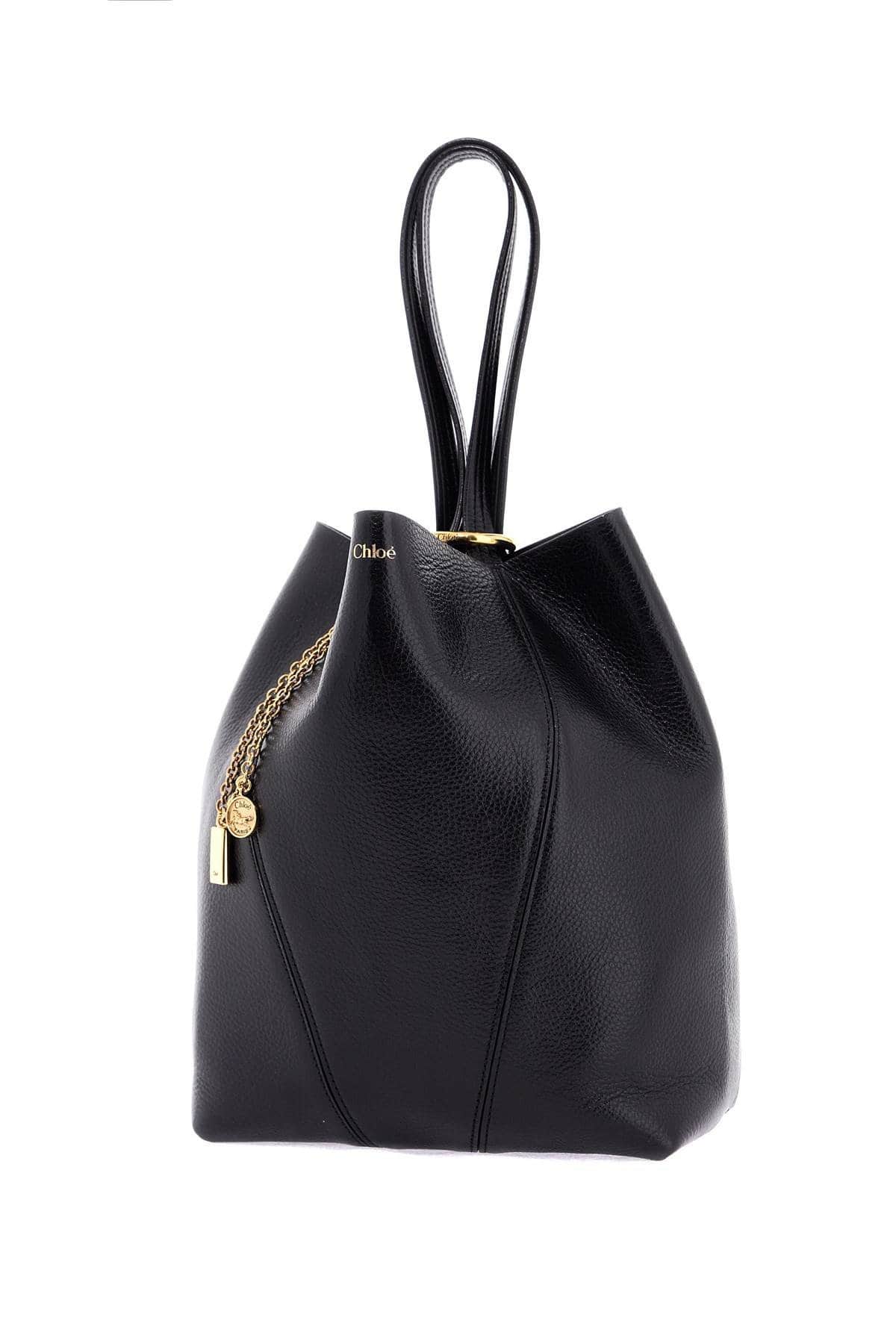 The Chlo Spin tote bag is made of hammered leather with a glossy finish, featuring a panel construction and decorated with charms and a removable ring that can be inserted into the handles to create a different design. It has an unlined main compartment and gold-tone hardware.