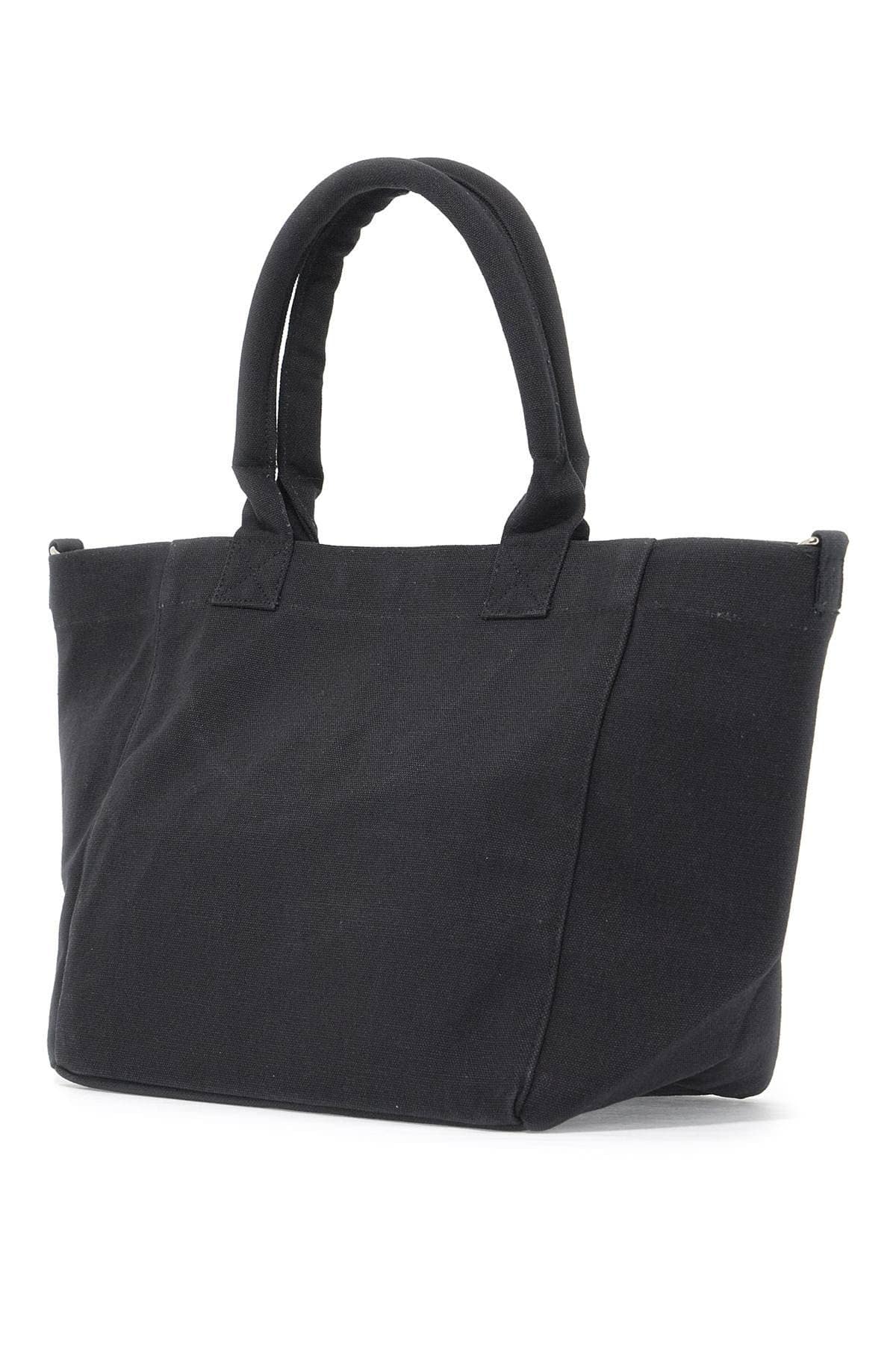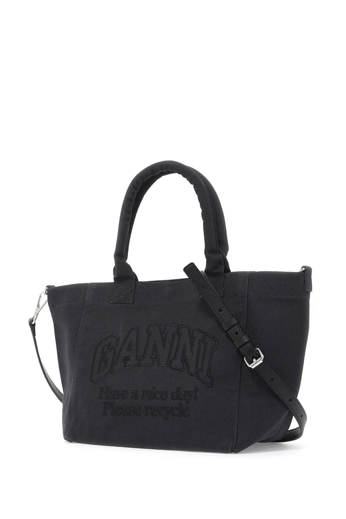 The GANNI tote bag is made from recycled cotton canvas and features a tonal embroidered logo lettering on the front. It has a double top handle design and comes with an adjustable recycled leather shoulder strap. The bag closes with a magnetic button and has an unlined interior. The metal accessories have a silver finish.