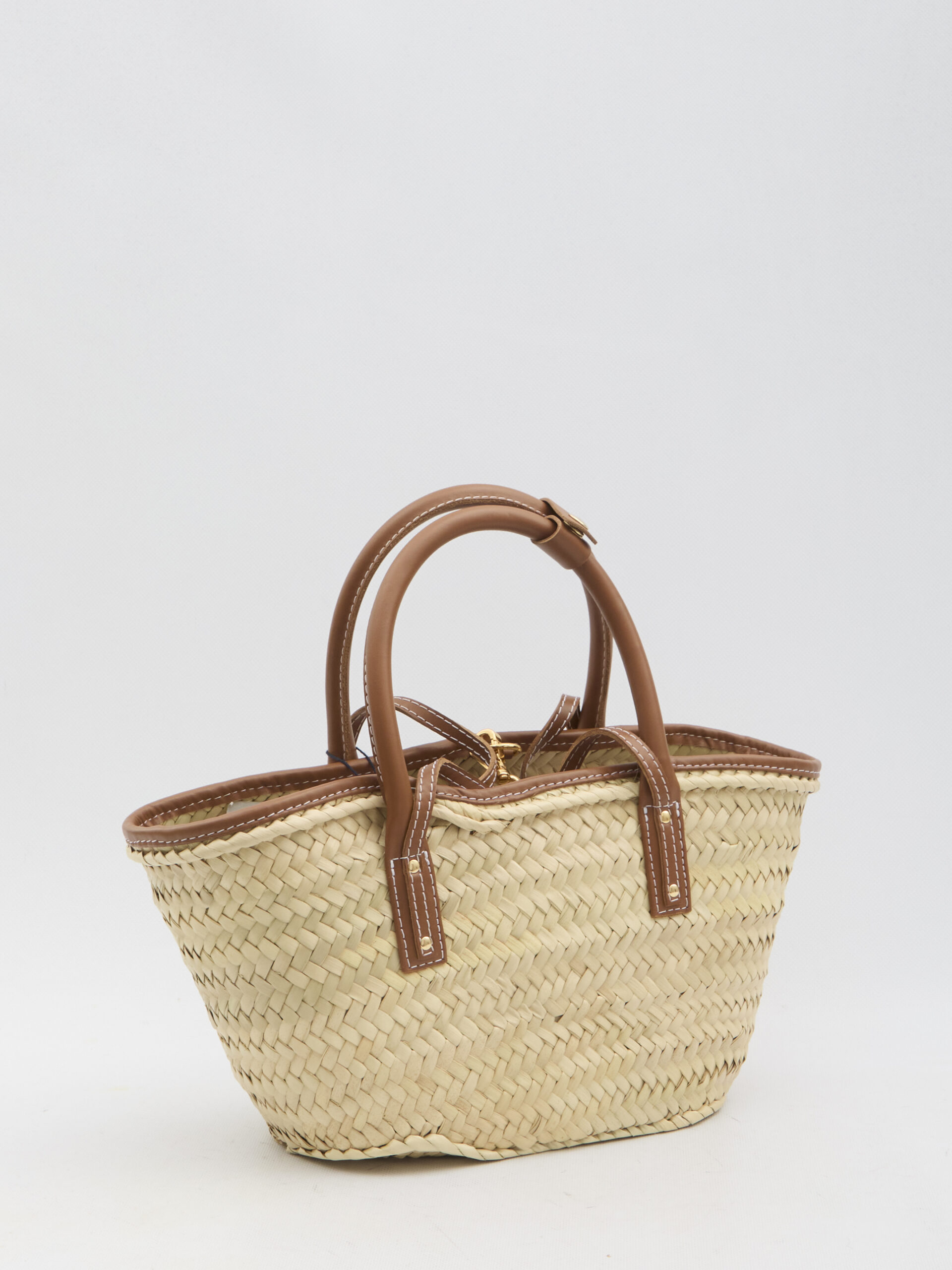 Le Petit Panier Soli beach bag, handwoven with smooth brown leather details. It features two fixed leather top handles with a tab and snap button, two long, thin fixed leather top handles, a custom lobster clasp closure, a front leather pocket with a golden metal logo on the front, brown leather edges, and one main internal compartment. Dust bag included. Any imperfections in the leather and materials should not be considered manufacturing defects, but rather a characteristic of the material.