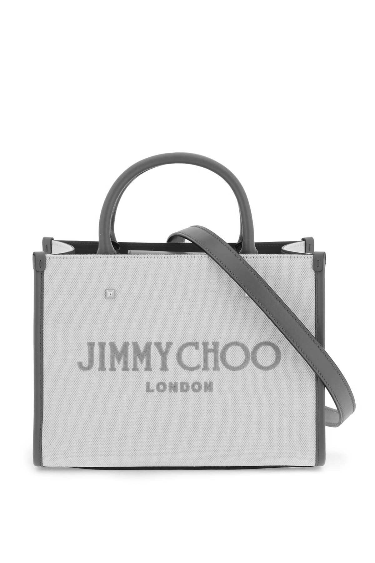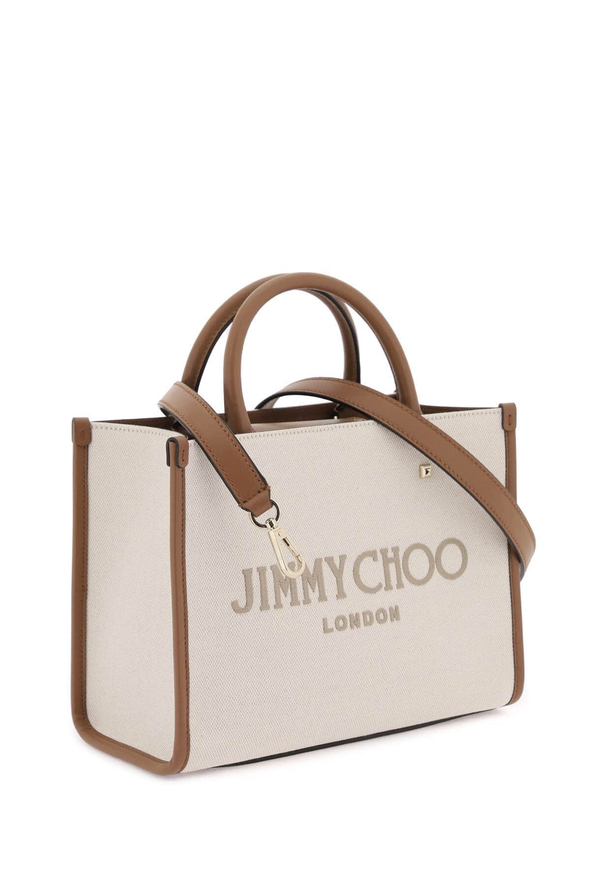 Avenue Tote bag by Jimmy Choo made of recycled cotton canvas with leather trims and decorated with studs and distinctive embroidered logo at front. Magnetic closure, canvas lining, one zippered pocket and two open pockets. Leather double handle and removable shoulder strap, protective feet at base. Gold-finished metalware.