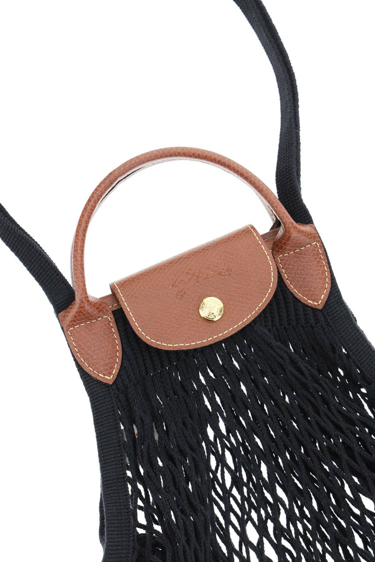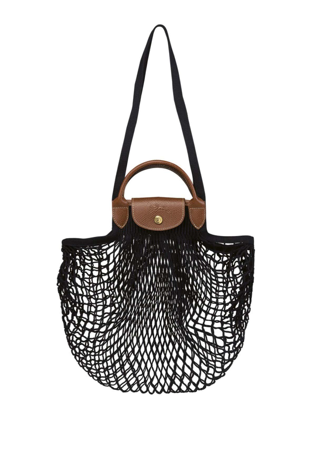 Le Pliage Filet tote bag by Longchamp, in collaboration with the French company FILT, famous for the production of mesh shopping bags, made from woven cotton with double handle in Russian leather and double shoulder handle in cotton. Leather flap with the iconic embossed logo and golden metal snap button.