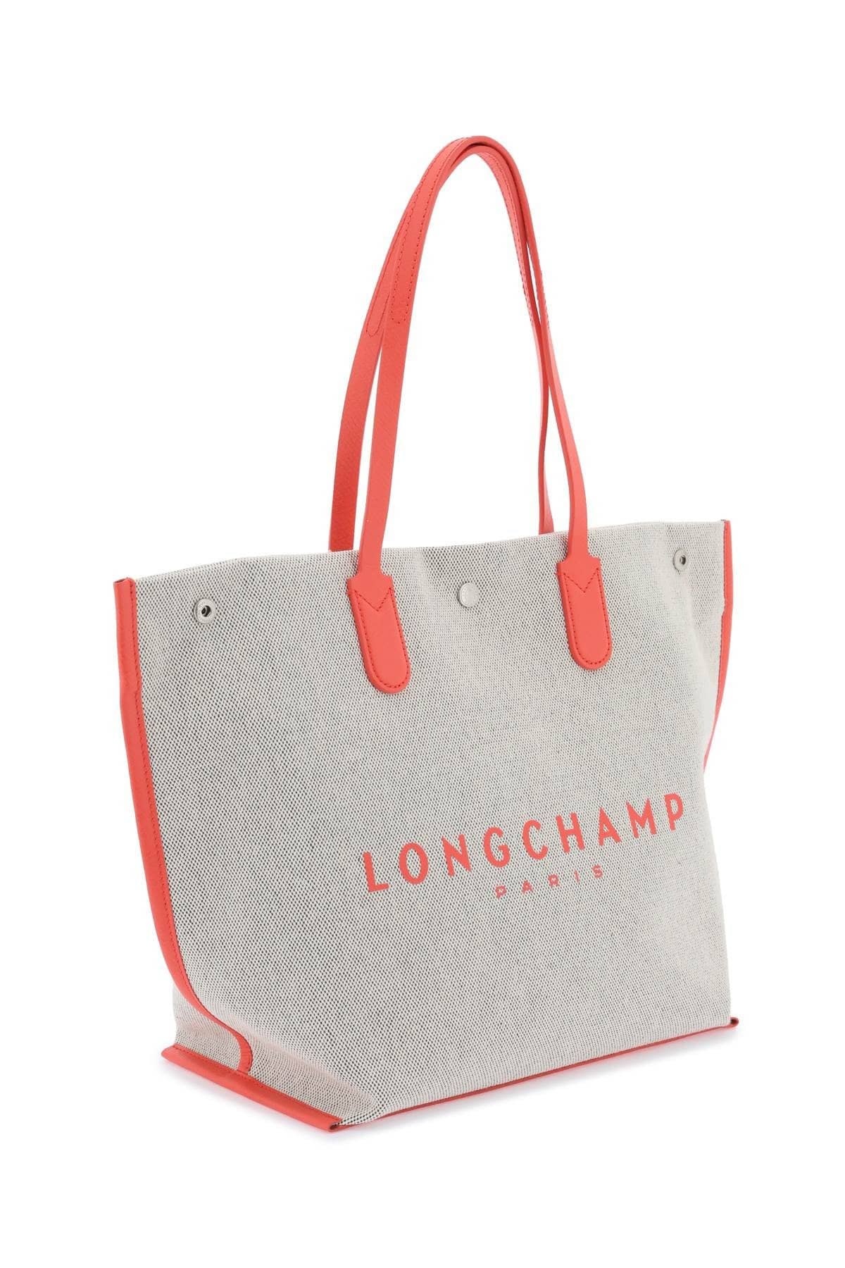 Shopping bag by Longchamp crafted in dotted cotton canvas, characterized by the contrasting iconic horse on one side and lettering logo print on the other side. Leather trims, base and double handle that can be worn by hand or on the shoulder, side buttons and central snap closure in silver-tone metal, unlined interior with a zip pocket and two flat pockets.